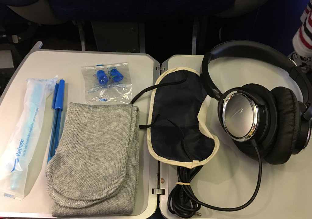 Once we took our seats we sampled our first taste of the BA World Traveller Plus experience. On our seats was a small pillow, blanket, noise cancelling headphones and an amenity kit (containing a toothbrush, toothpaste, pen, socks and an eye mask). Within minutes of sitting down in their seats the girls were having fun trying on their eye masks and socks.