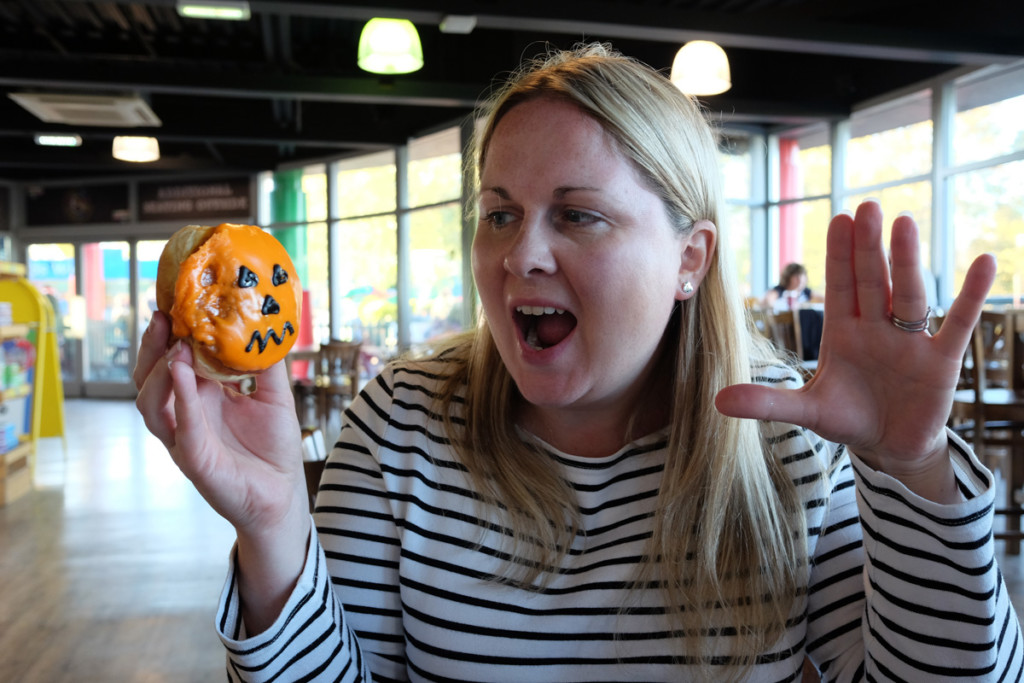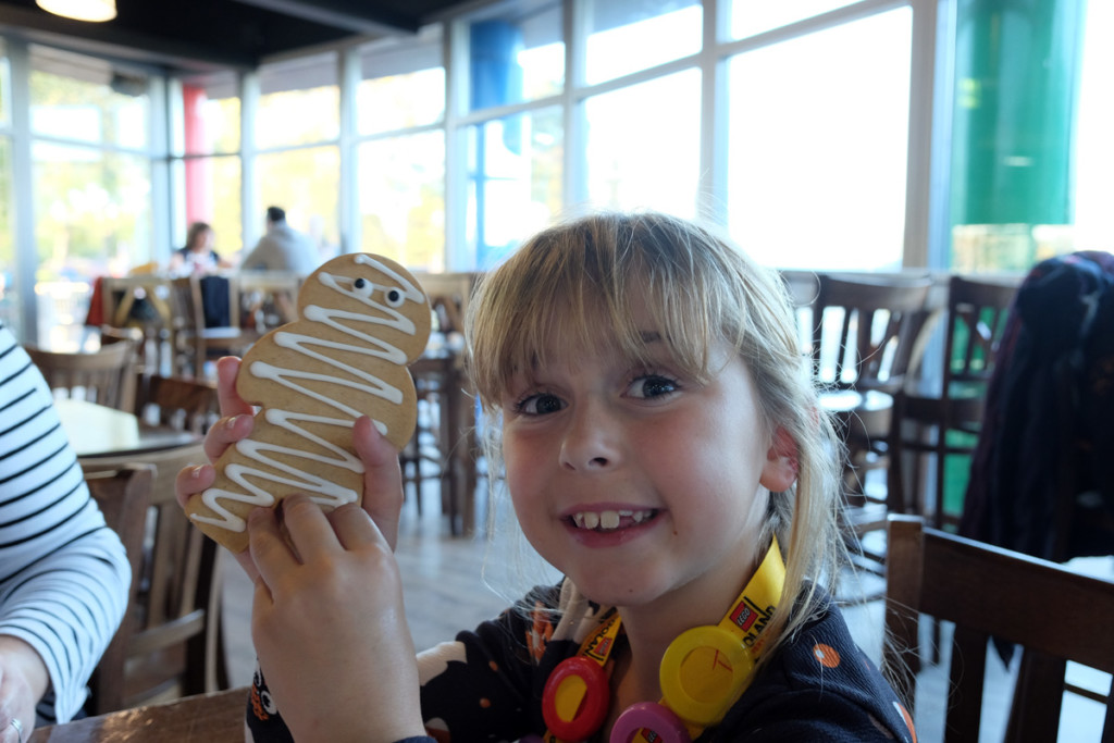 One of our favourite places to eat at LEGOLAND is at the Hilltop Café, which has some of the best views toward Windsor and the city of London. For Halloween they had lots of delicious treats that we couldn’t resist including pumpkin doughnuts, zombie cookies and day of the dead jammie biscuits.
