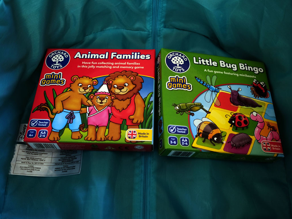We always take a selection of compact travel games or books with us on our journey to keep the girls entertained. We are big fans of Orchard Toys and Galt and some of our favourites are Little Bug Bingo, Animal Families, Travel Foil Art and Travel Mosaics to keep the girls entertained.