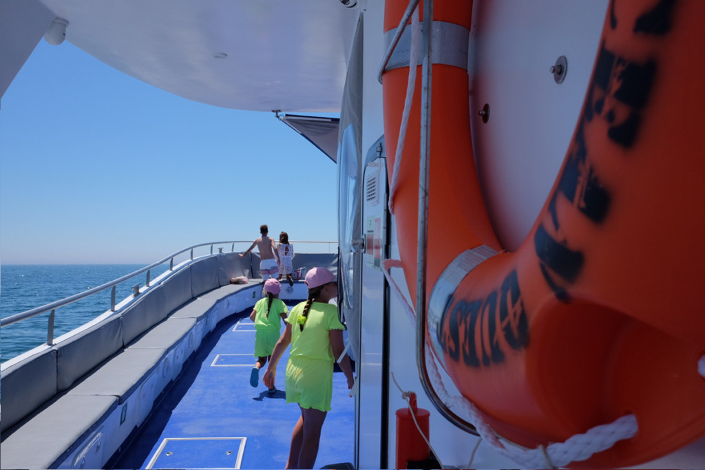 Many of the other companies who run boat tours out of Vilamoura use speedboats which meant that we would be strapped into our seats, which would have meant a much more restrictive experience especially with kids. The company advertises itself as being a great choice for families and it truly is.