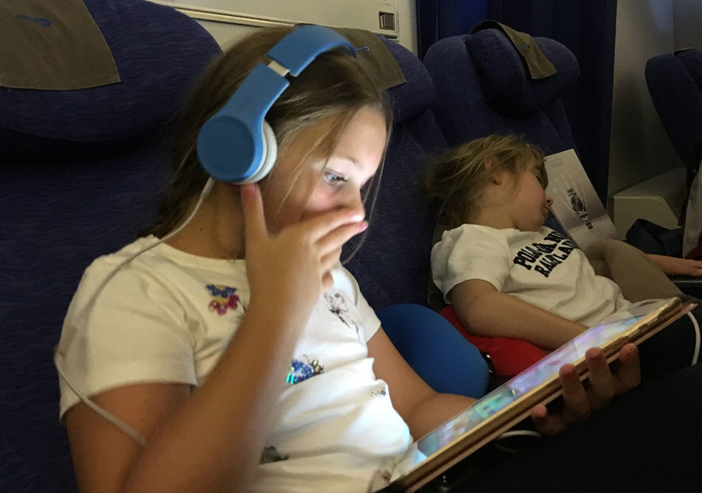 Once we took our seats we sampled our first taste of the BA World Traveller Plus experience. On our seats was a small pillow, blanket, noise cancelling headphones and an amenity kit (containing a toothbrush, toothpaste, pen, socks and an eye mask). Within minutes of sitting down in their seats the girls were having fun trying on their eye masks and socks.