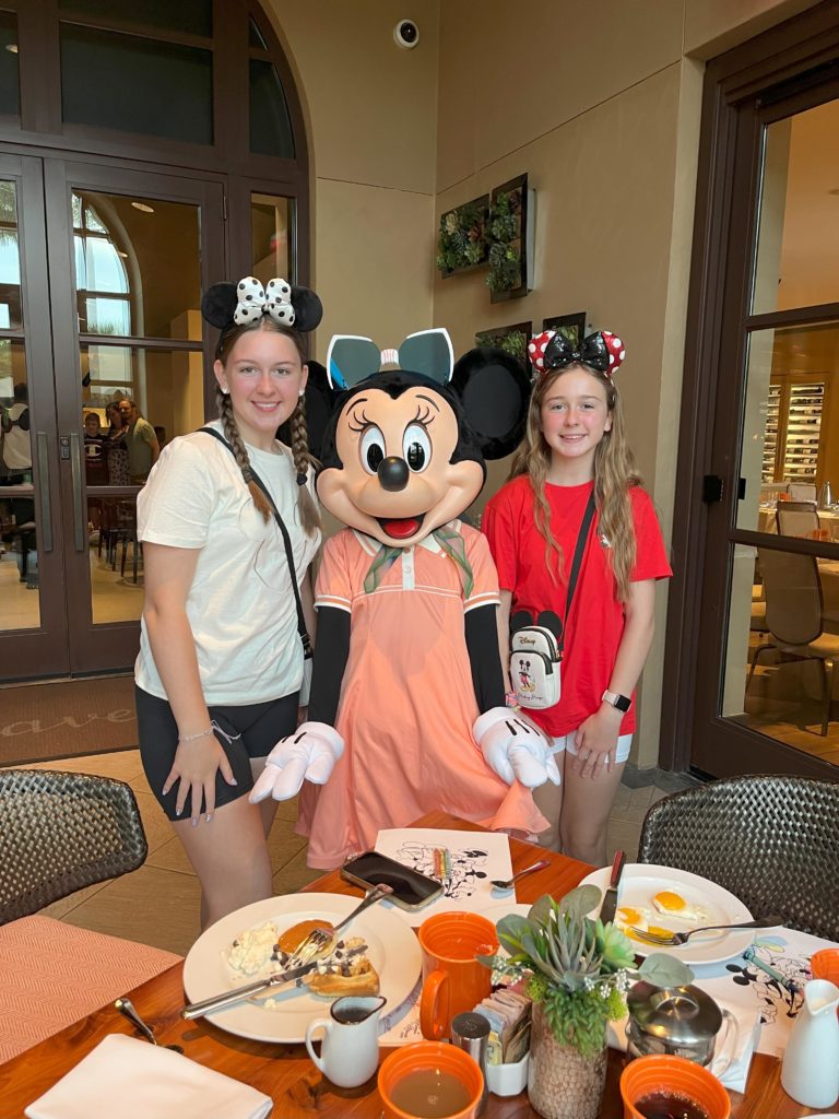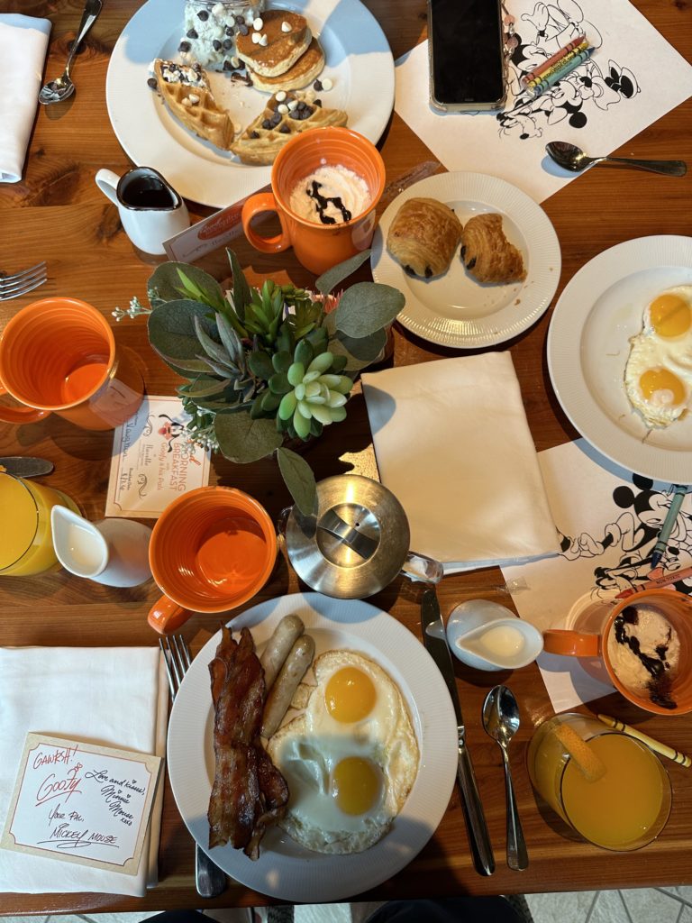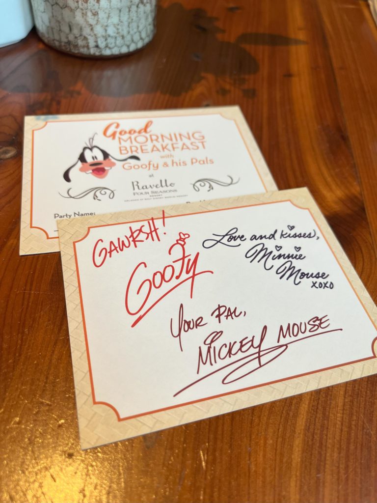 You have multiple opportunities to meet with Goofy, Minnie and Mickey throughout breakfast and each character spends several minutes with you at your table for pictures and interactions, which was so much fun.  Each table also receives a special souvenir card with the characters’ autographs  already on it which gives you more time to spend having fun with them.