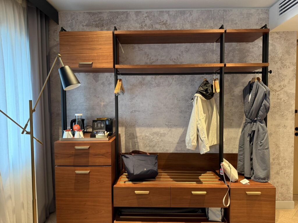 In keeping with the modern design, you won’t find traditional wardrobes here. Instead, there is an open storage unit with a hanging rail and drawers. I actually found this worked better for a short city break, with easy access to suitcases and clothing.