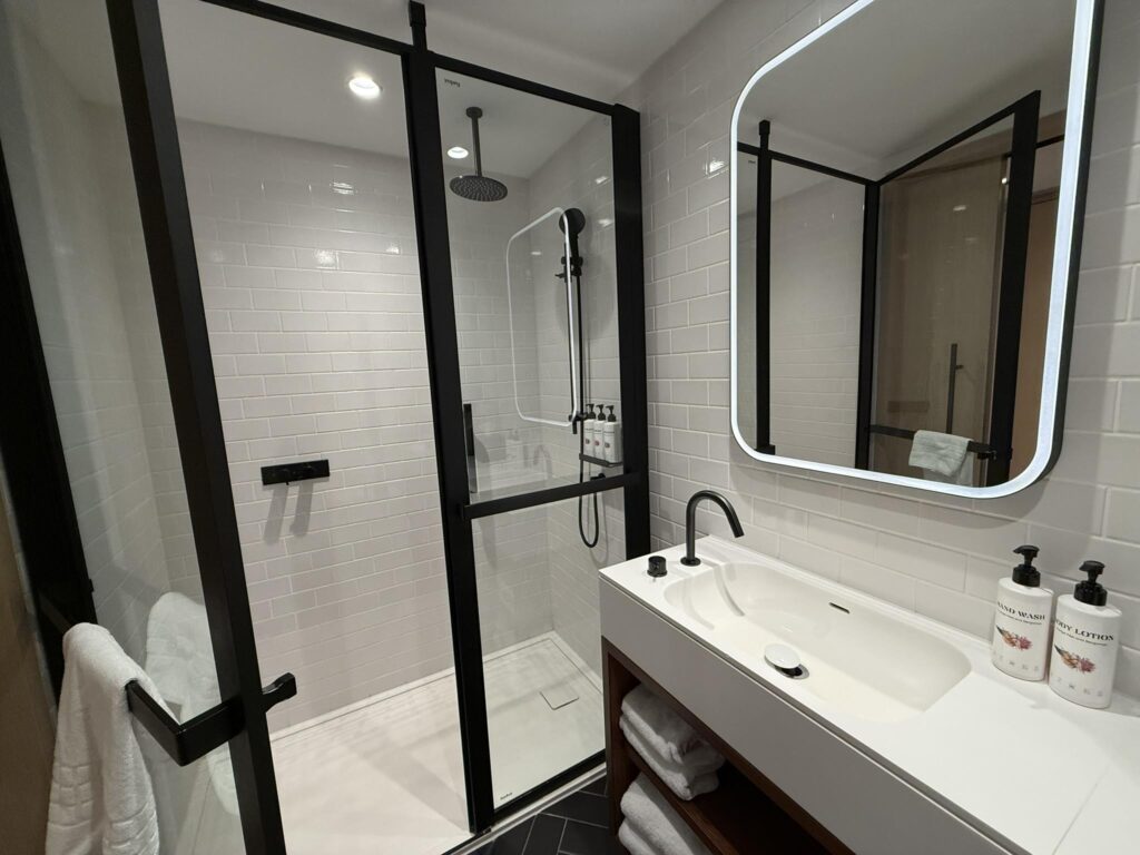 Bathrooms here are incredibly stylish and modern. White tiles with matte black finishes complemented a large walk-in shower with a powerful rainfall showerhead.