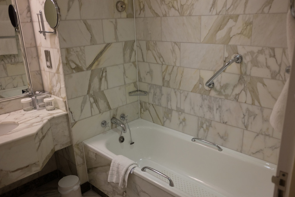 The bathrooms were one aspect of the rooms that have yet to see a makeover. However clad from floor to ceiling in sumptuous marble it was well-equipped with a bath, separate shower plus delightful Elemis toiletries which are one of my favourites.