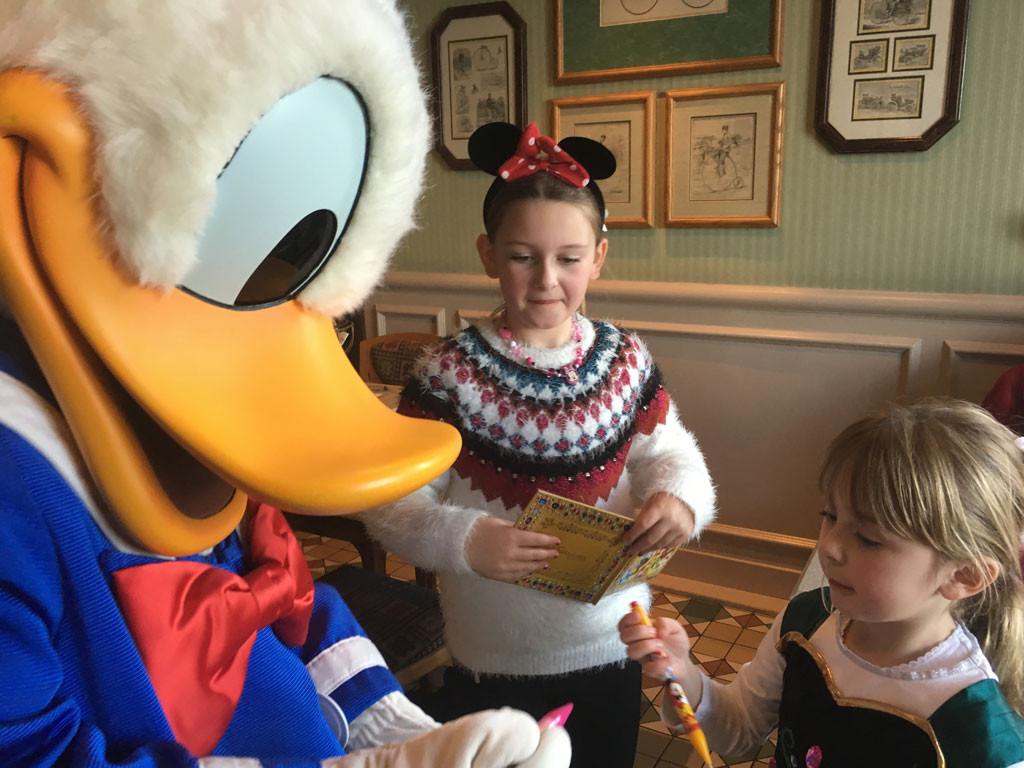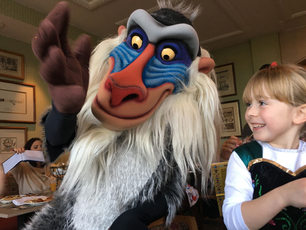 As we were eating, more characters made their way around to our table starting with Rafiki from the Lion King. Rafiki was brilliant and the girls had so much fun interacting with him, where he would pretend to steal their autograph books, playing with their hair and being mischievous.
