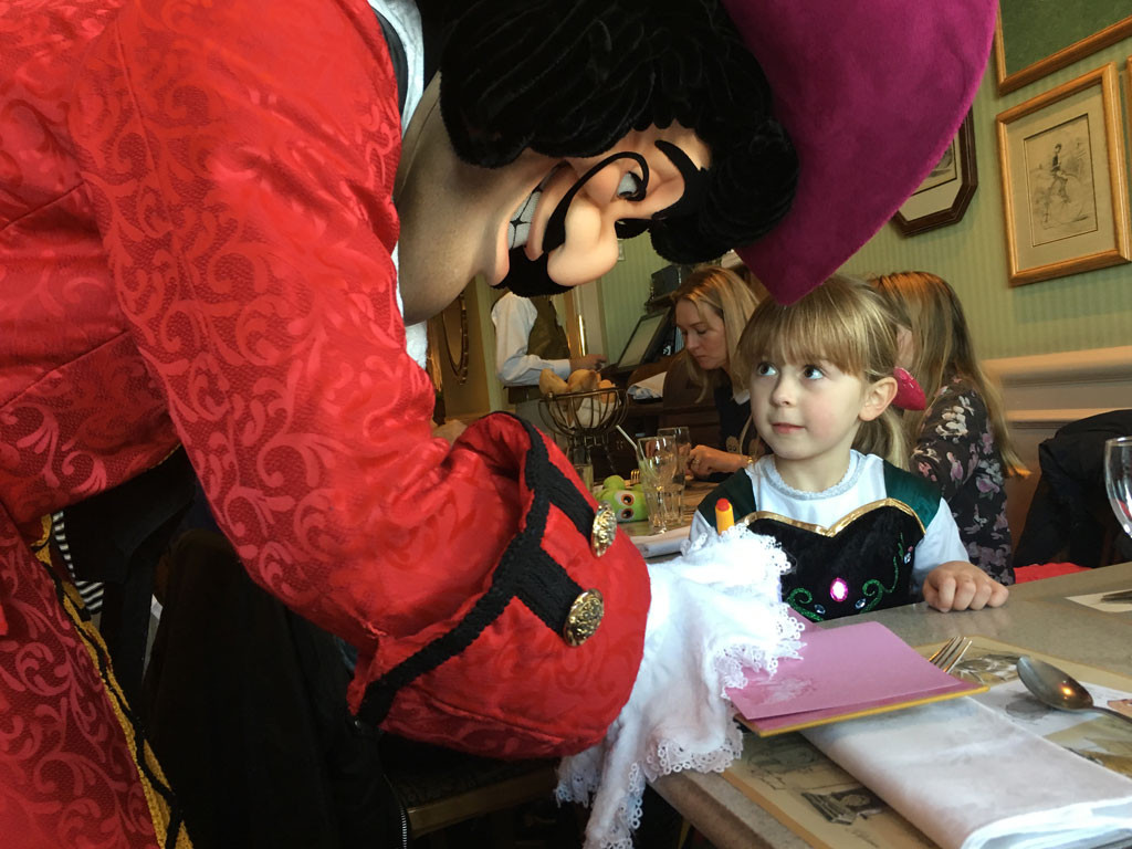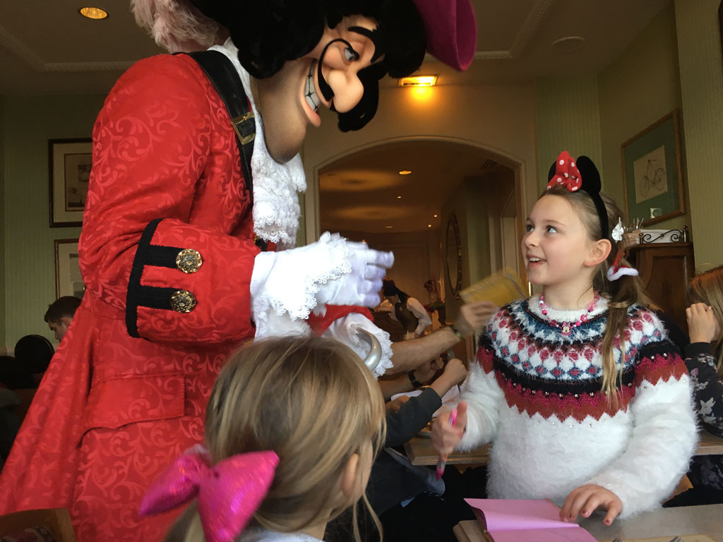 As soon as we were seated, our waiter brought over a bread basket and took our drinks order and we met our first Disney character, Captain Hook. Watching the girls mesmerised as he spent time with them, signing their autograph books and having photos, they were so excited.