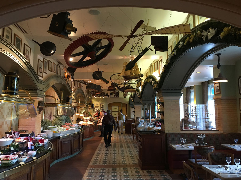 The dining room at Inventions is filled with so many beautiful details in keeping with the theme of the late 19th and early 20th century. Suspended from the ceiling of the buffet area were lots of antique bicycles, typewriters, vacuum cleaners etc all contributing to the Inventions theme from the Victorian era of discovery and travel.