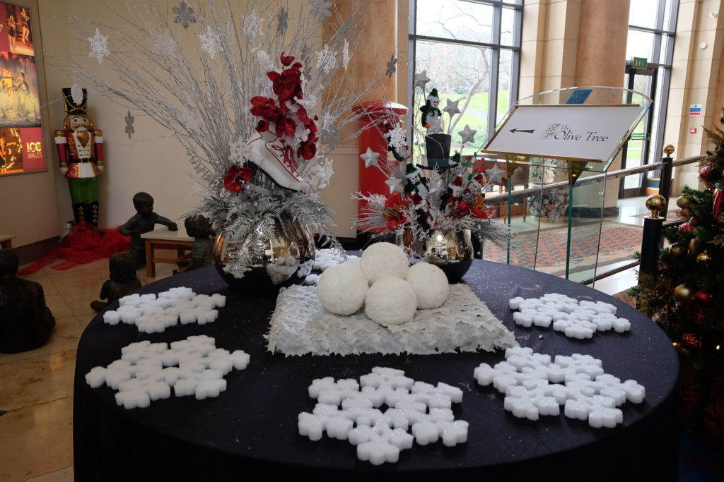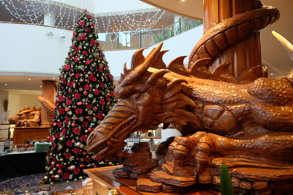 The elegant six-storey atrium lobby at the Celtic Manor is impressive at any time of the year especially with its gigantic wooden Celtic Dragons straddling either side of the room, but at Christmas it’s even more spectacular.