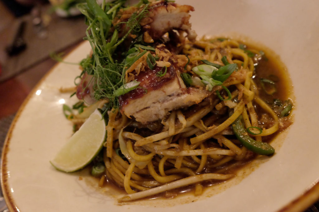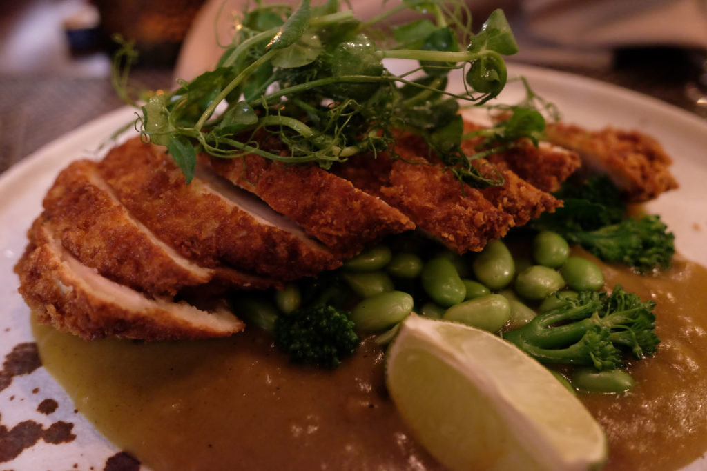 Moving on to mains, I couldn’t resist the Chicken Katsu with Edamame beans, oyster mushrooms and stem broccoli, curry sauce and my husband chose the Singapore Noodles with Hoisin Glazed Pork Belly, both of which were delicious.