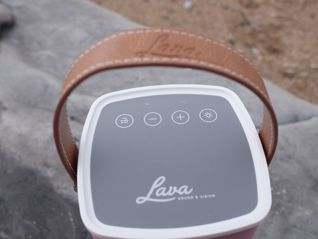 At the top of the speaker are the controls for play/pause, volume, answering calls and a button for the LED lamp.