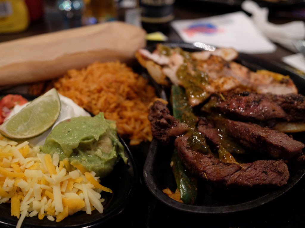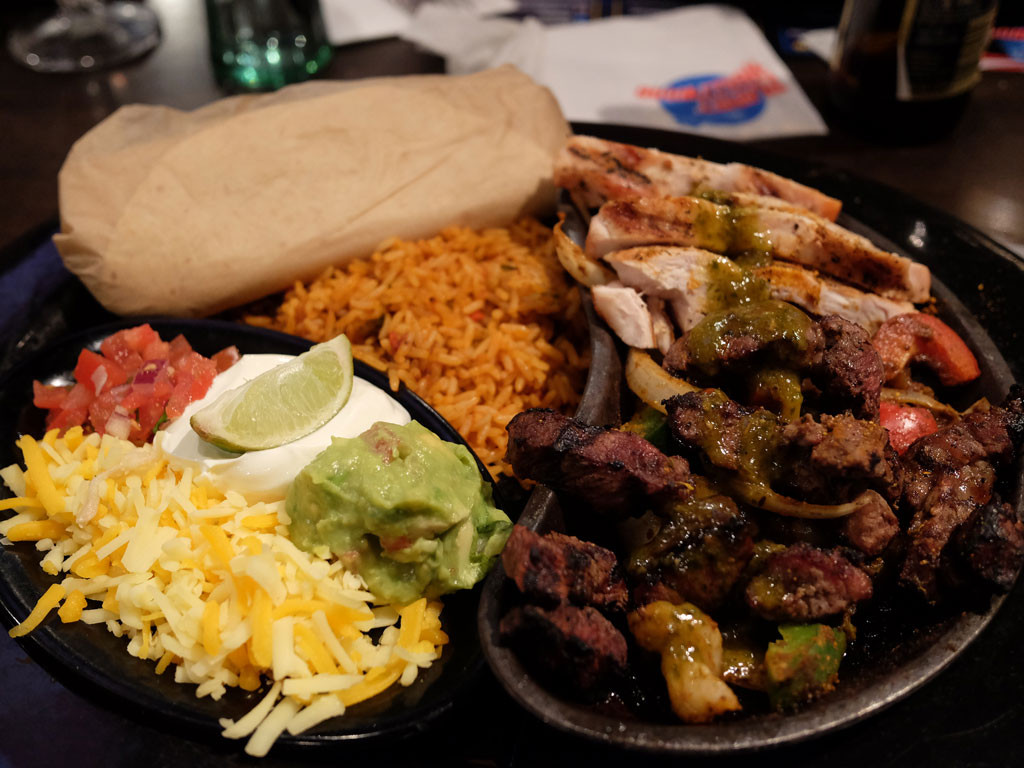 Our sizzling chicken and steak fajitas arrived, chargrilled with cajun spices and served with sizzling onions, red and green peppers, fresh guacamole, pico de gallo, sour cream, black beans, mild red and white cheddar cheese, Mexican rice and flour tortillas.