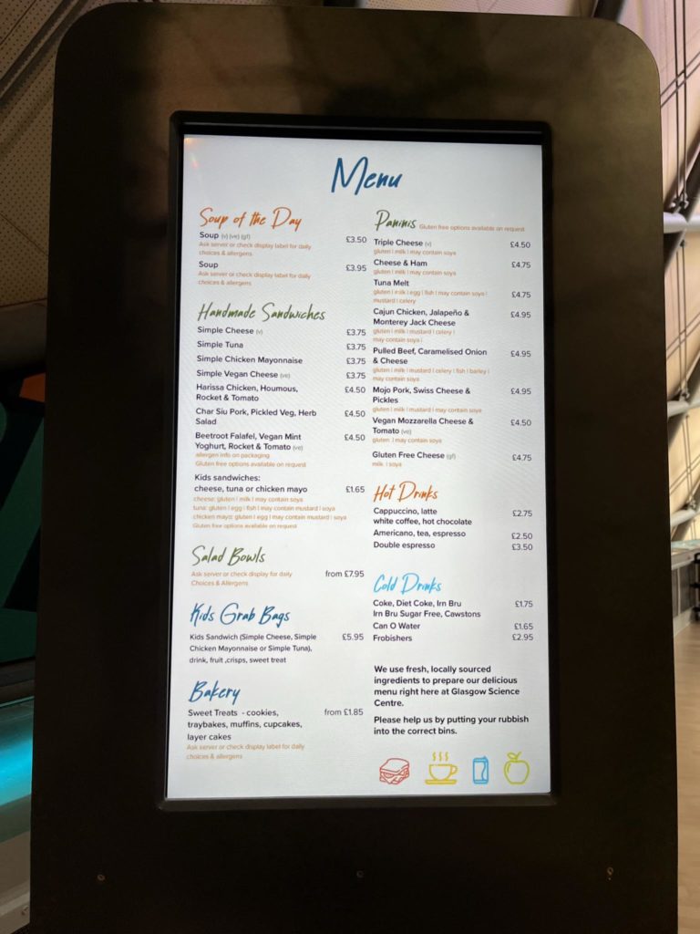 There is a large café here serving a wide range of hot and cold snacks along with a coffee shop in the IMAX building.  There were also plenty of space here if you brought a packed lunch with you, although prices at the café were pretty reasonable for a visitor attraction.