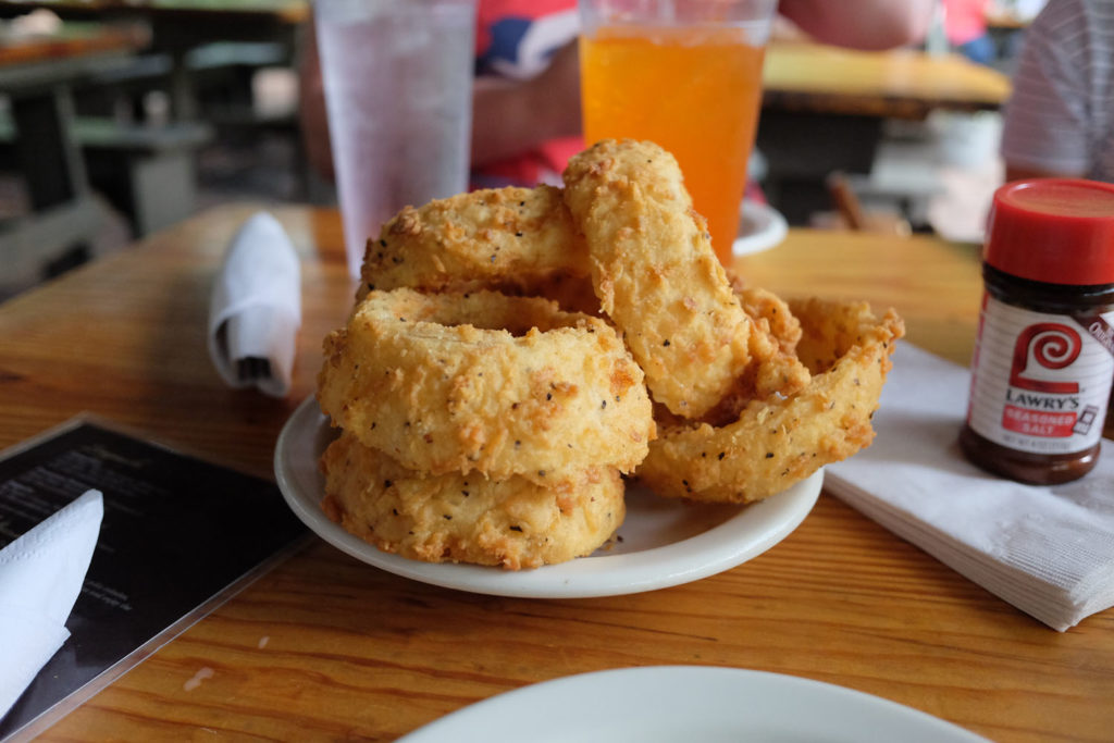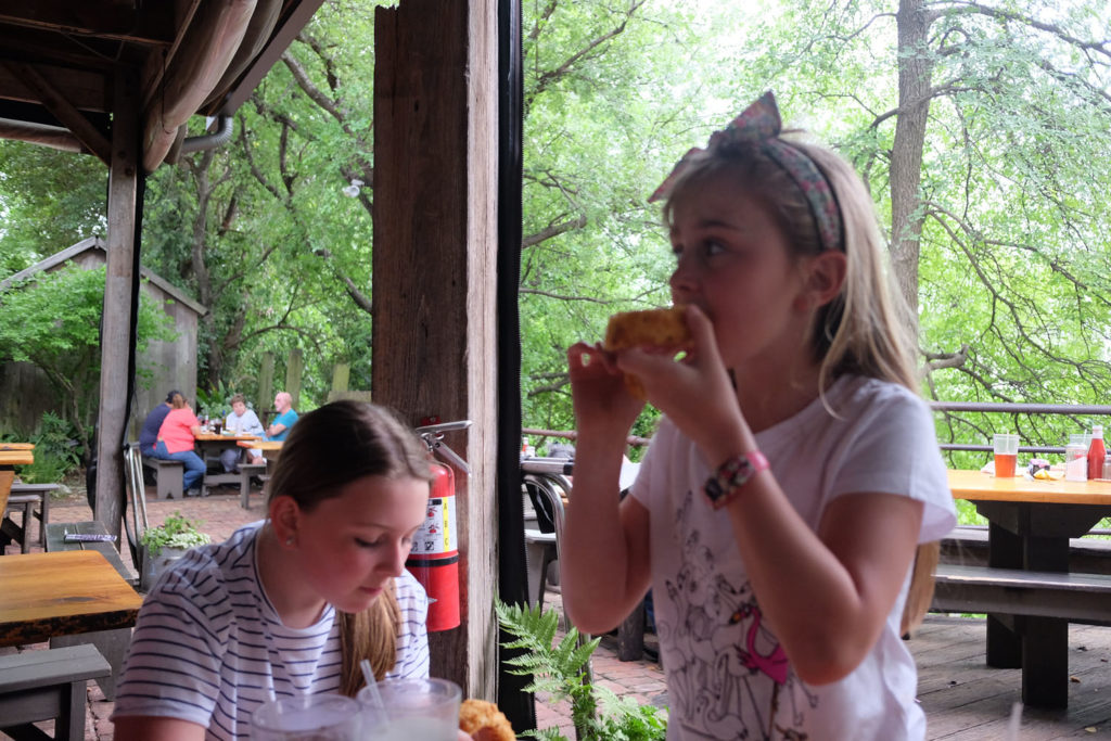 If the weather is good I would ask to sit out on the deck like we did as it offers great views of the Guadalupe River. The meals here are delicious and very reasonably priced and like everything in Texas the portion sizes were huge – check out the size of the onion rings.