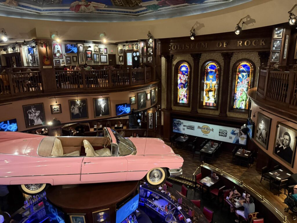 We were seated on the upper floor, in a prime spot overlooking the main circular bar and the legendary pink 1959 Cadillac spinning above it. It’s one of those moments that makes you pause and soak it all in  and it’s a great photo opportunity.