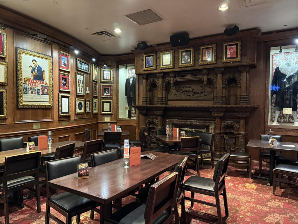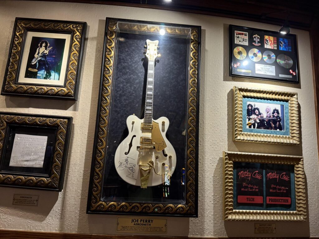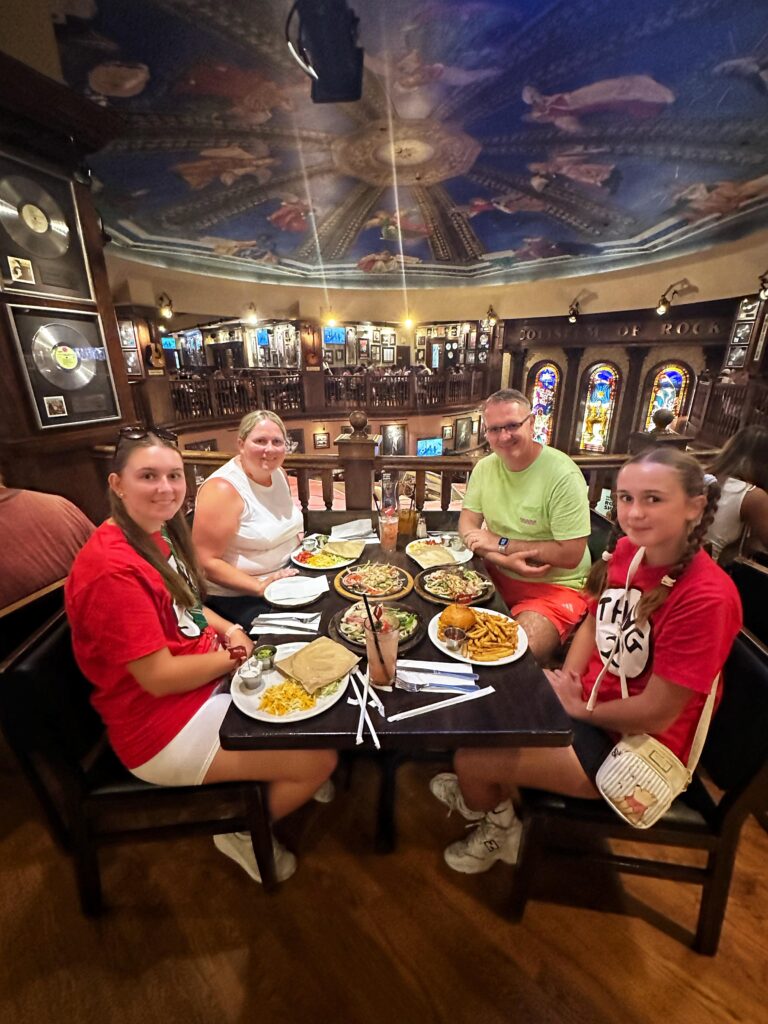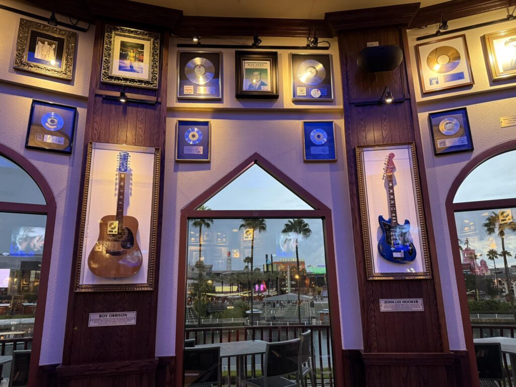 Before we even reached our table, we paused for one of the must-do traditions at the Hard Rock Café – holding the famous electric guitar for a photo. It’s a marketing gimmick, but you can also take your own photos, and it perfectly captures the spirit of Hard Rock Orlando: fun, playful and a music lover’s dream.