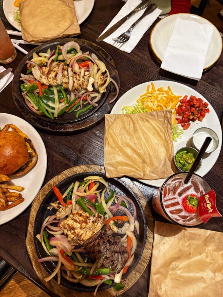 For mains, we went for our long-time favourites: chicken and steak fajitas. Arriving on sizzling cast iron skillets, they were well worth the wait. The fajitas were generous and served with freshly made guacamole, sour cream and pico de gallo. The warm tortillas came in a small paper bag to seal in the heat – a simple touch that makes all the difference. One of our daughters opted for the Hard Rock cheeseburger, which, like all our mains, was delicious.