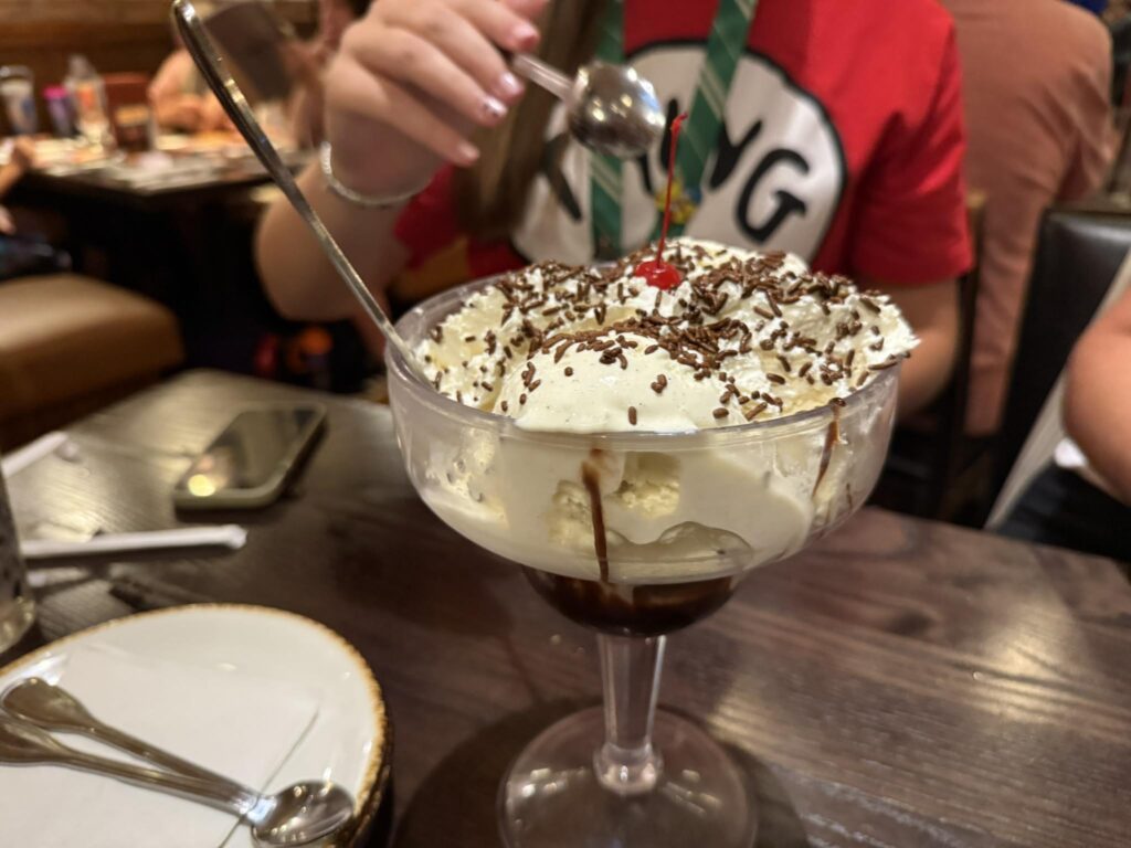 The portions at Hard Rock are legendary, and desserts are no exception. We shared a hot fudge sundae served in a giant martini glass – more than enough for all four of us.
