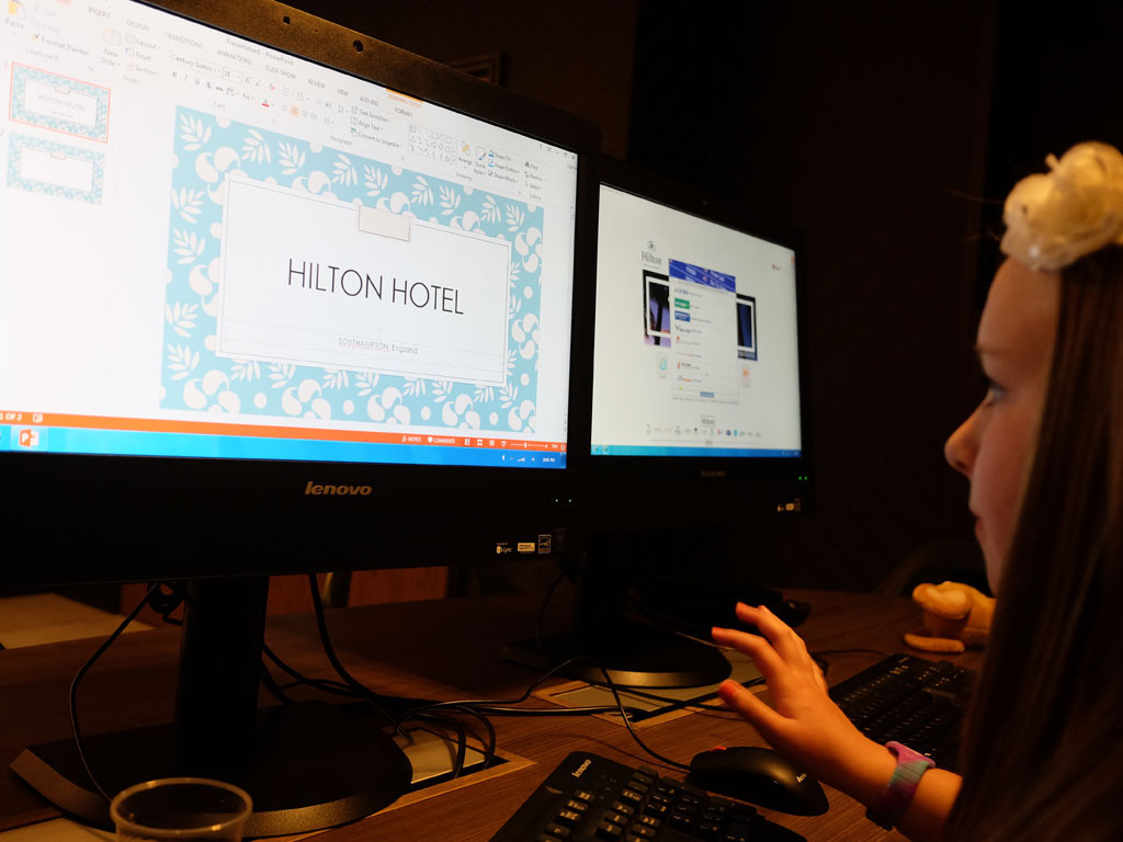 There are lots of beautiful communal spaces to relax in at the hotel, and one of the favourite areas for the girls was the business centre, located within the vast lobby area. Using the complimentary computers they quickly got to grips with Powerpoint and started creating Hilton branded stationary as they pretended to check their daddy into the hotel.