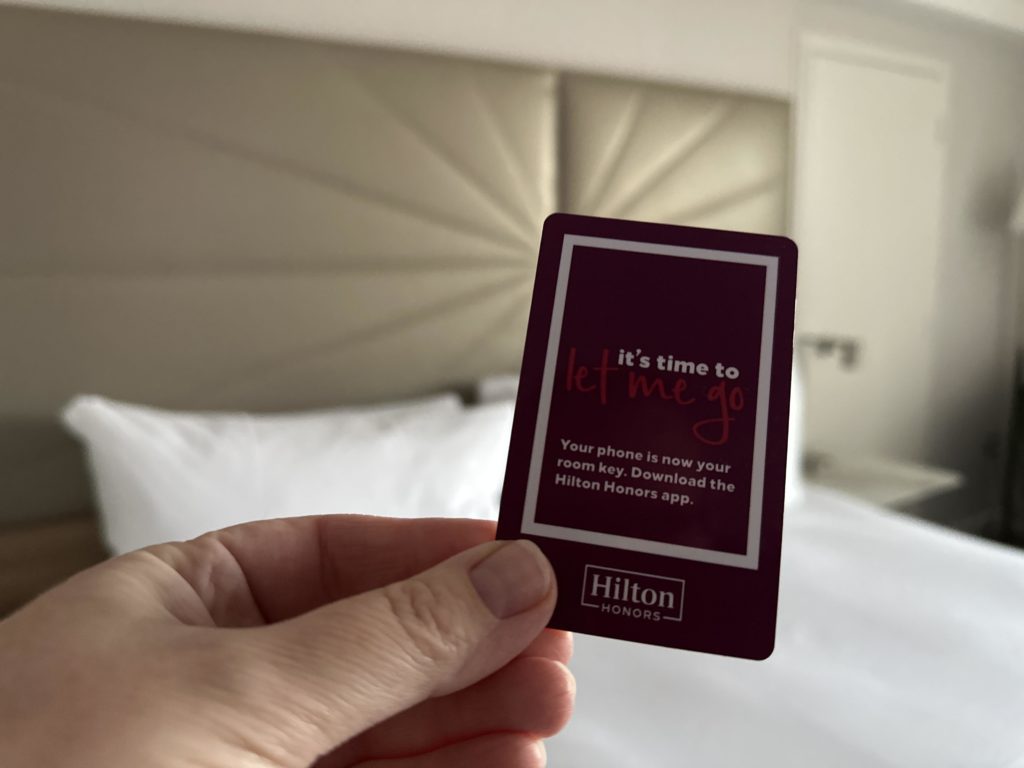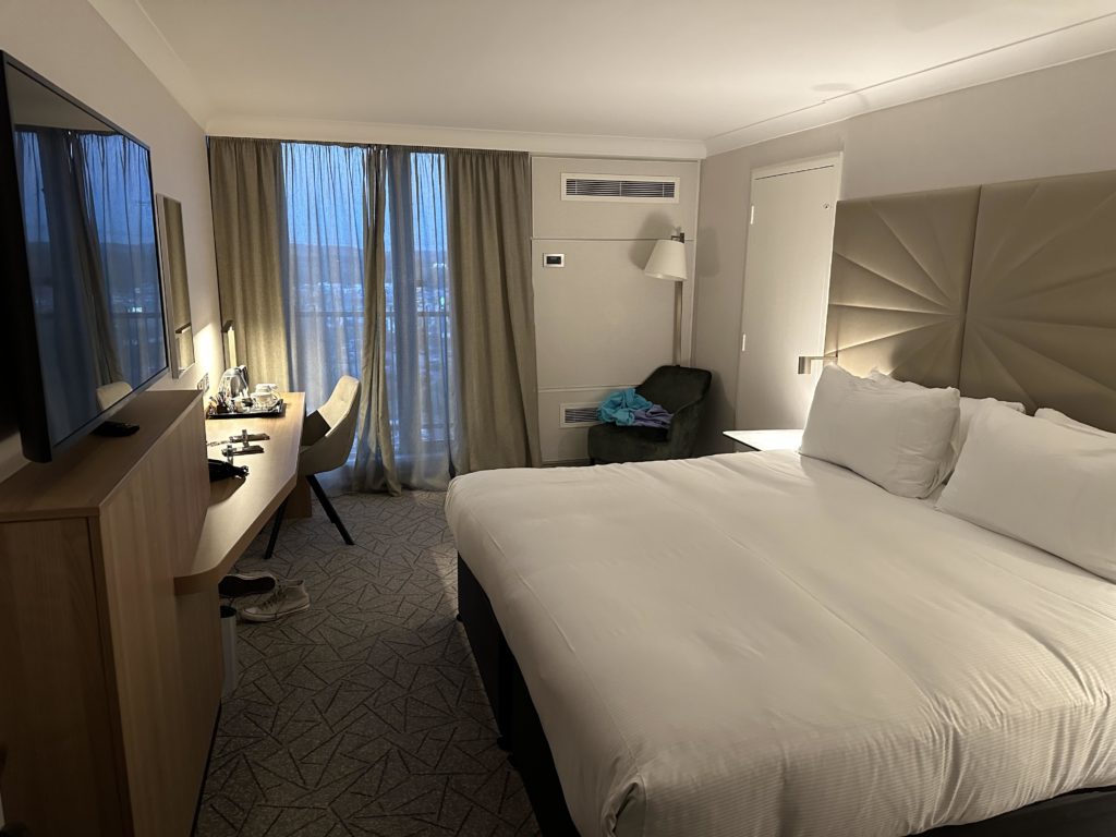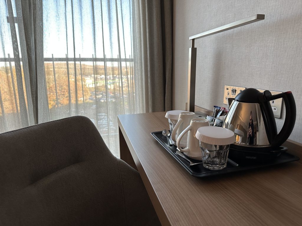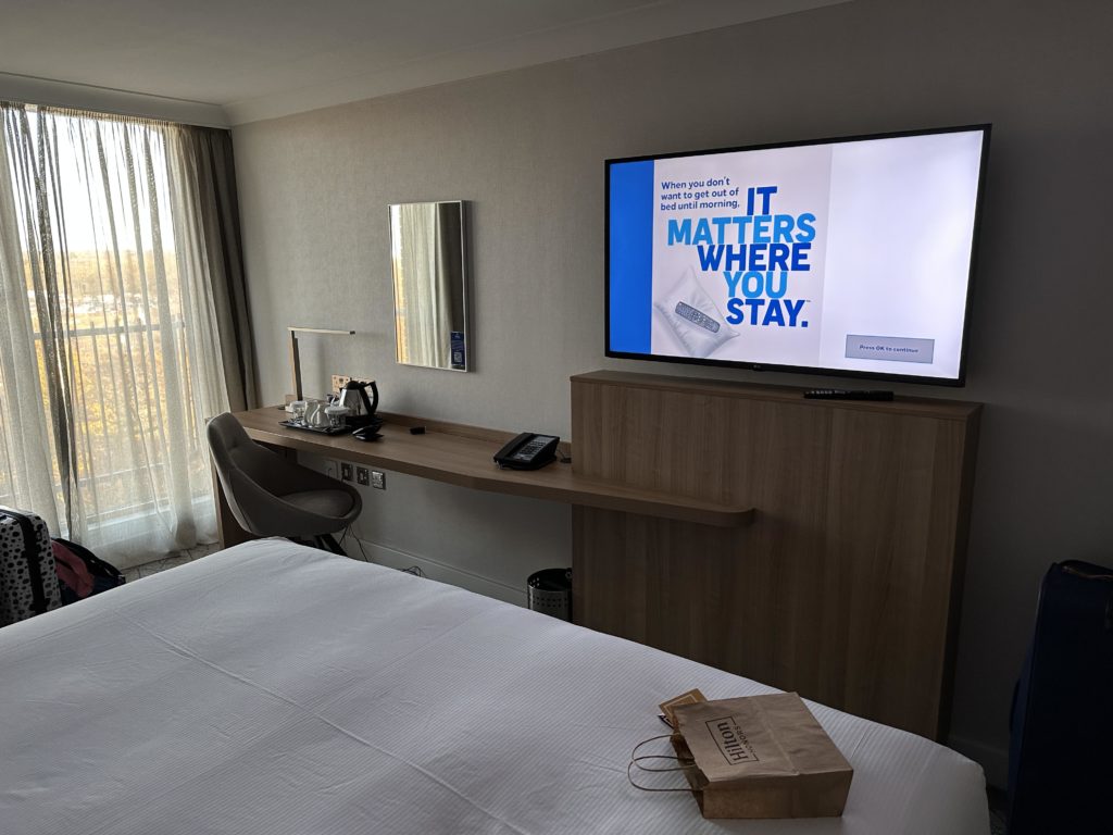 As for amenities, apart from a fridge our rooms had all of the amenities you’d expect from a Hilton hotel such as a air conditioning, tea and coffee making facilities, iron and ironing board and in-room safe. As you would expect in a refurbished room, there were plenty of plugs and USB charging sockets along with a spacious desk and a large wall mounted smart TV.