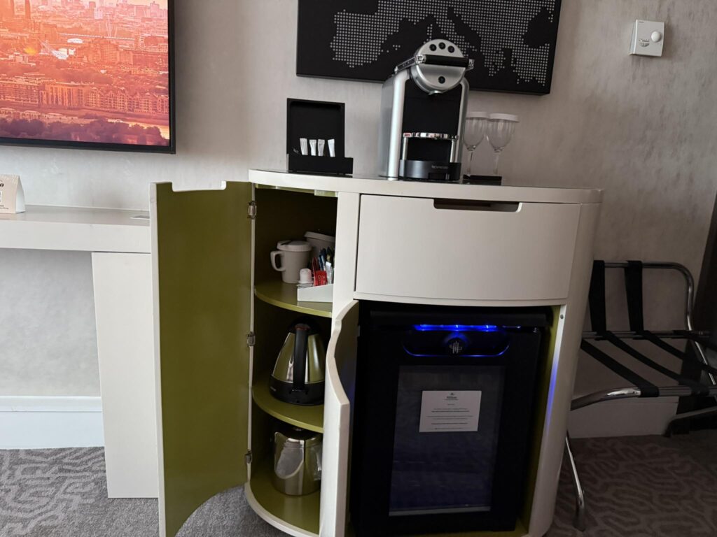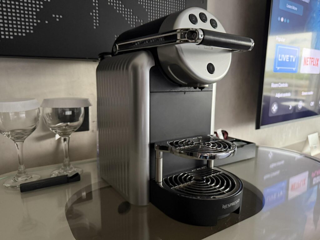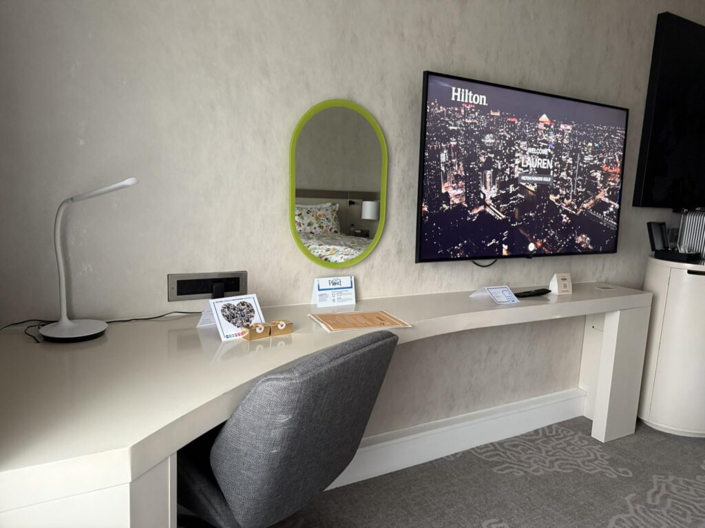 As for amenities,  our rooms had all of the amenities you’d expect from a Hilton hotel such as air conditioning, robes and slippers, Nespresso machines, mini fridge, iron and ironing board and in-room safe.  There was also a spacious work desk and loads of plug sockets in the room, including USB ports —perfect for recharging all our gadgets before the flight.