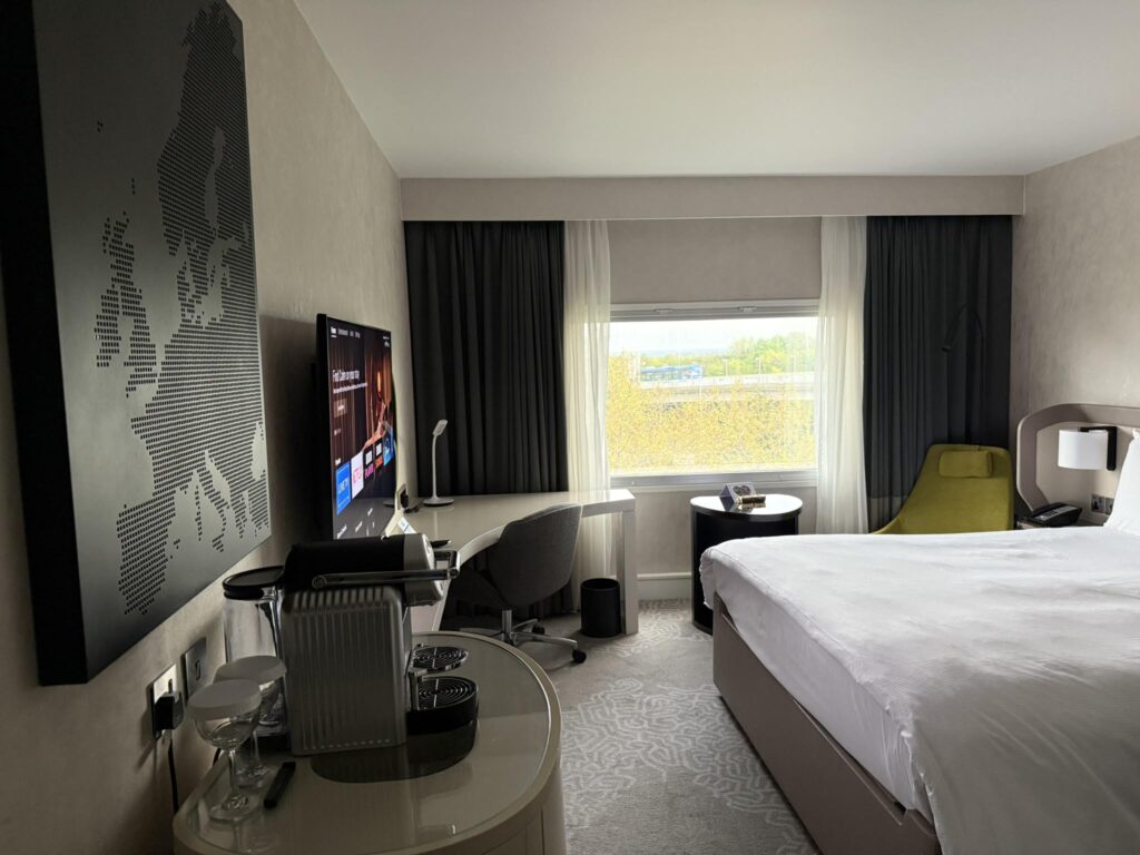 The Hilton’s location right by Terminal 4 is unbeatable, taking five  minutes to walk via a covered walkway to the check-in area.  Even if you are flying from Terminal 5 like we were its also a great choice. We took the free H30 bus which leaves every 20 minutes from the bus stop just outside Terminal 4 at bus stop 11. The bus journey to T5 took about 15 minutes and other options include the Piccadilly or Elizabeth train line via terminals 2 and 3, but this takes longer.