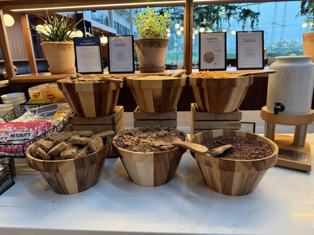 The Hilton Serenity beds were, as we have come to expect, really comfortable—with thick duvets, soft pillows and blackout curtains ensuring a great night’s sleep. Despite being right next to one of the world’s busiest airports, we didn’t hear a thing thanks to the triple-glazed windows.