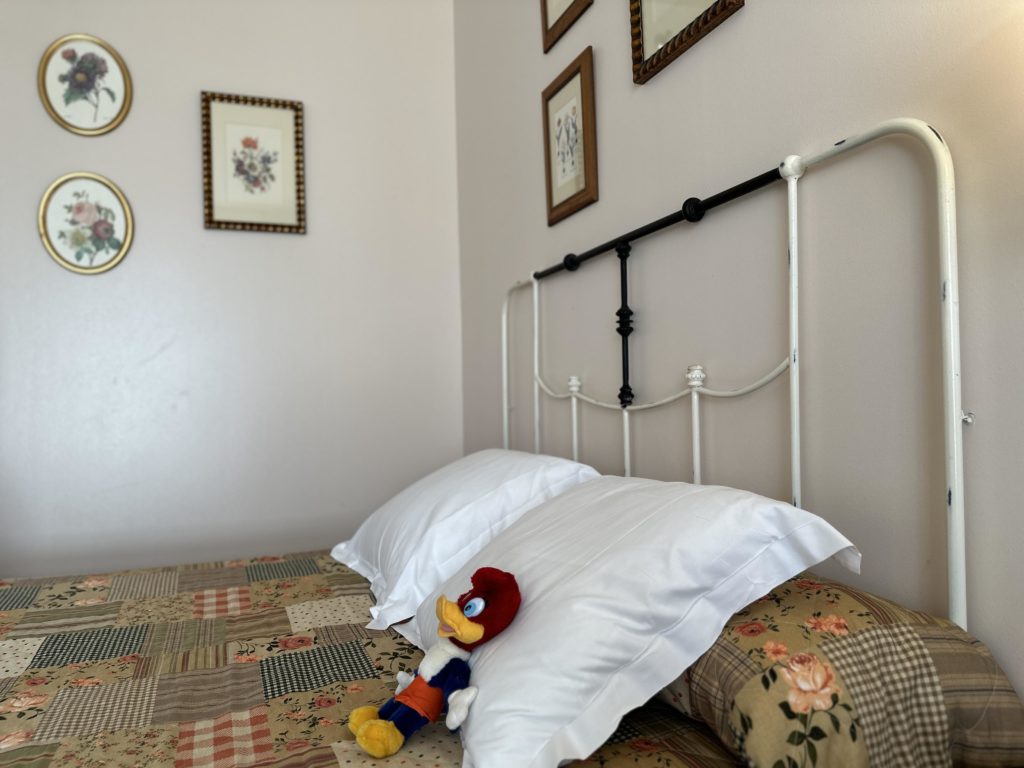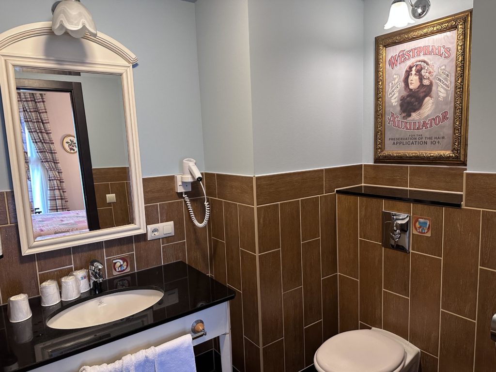 From the hotel photos the rooms might look a little dated in their design but this is all to do with the clever theming of the hotel. All rooms here are designed to resemble the old American West, with wood floors, white wood furniture, wrought-iron headboards, quilted bedspreads, plaid curtains and armchairs, and floral artwork – all of which added a unique touch to this hotel, I really liked it.
