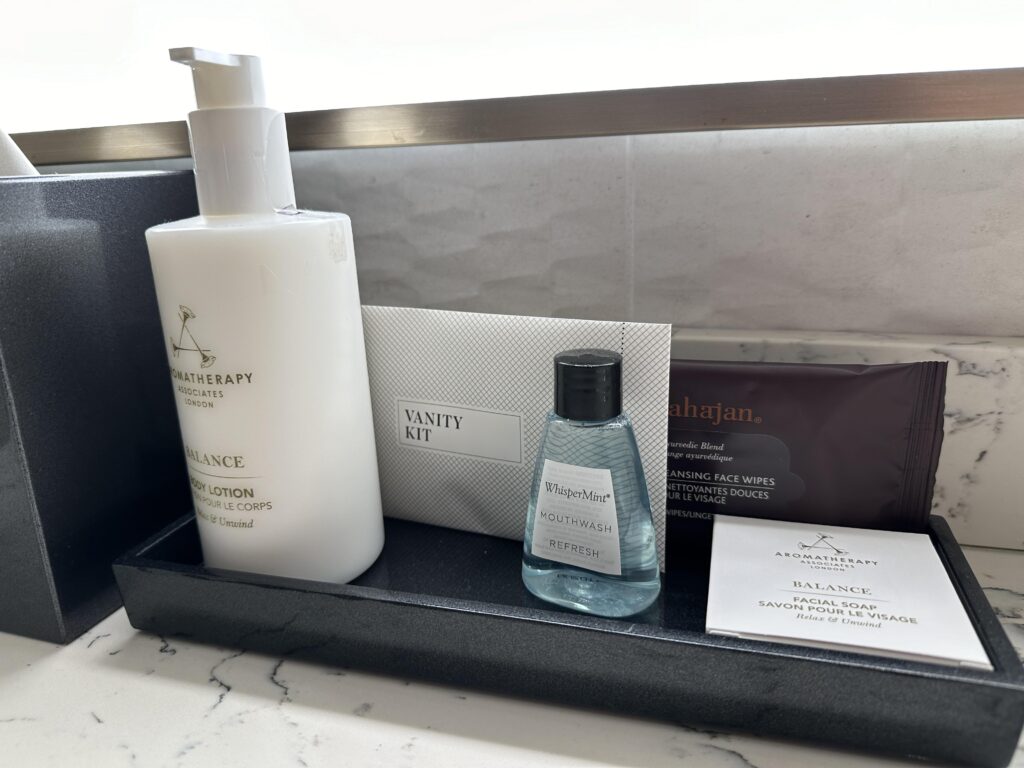 As much as I liked the bedroom, the bathroom was equally as nice. It had a clean, modern, and functional design with a large sink, plenty of country top space, walk-in rainfall shower with added attachment and a great large mirror with a backlight. It was stocked with toiletries from Aromatherapy Associates London as well as the usual amenities you’d expect – including bathrobes, slippers, vanity kits, mouthwash and facial wipes.