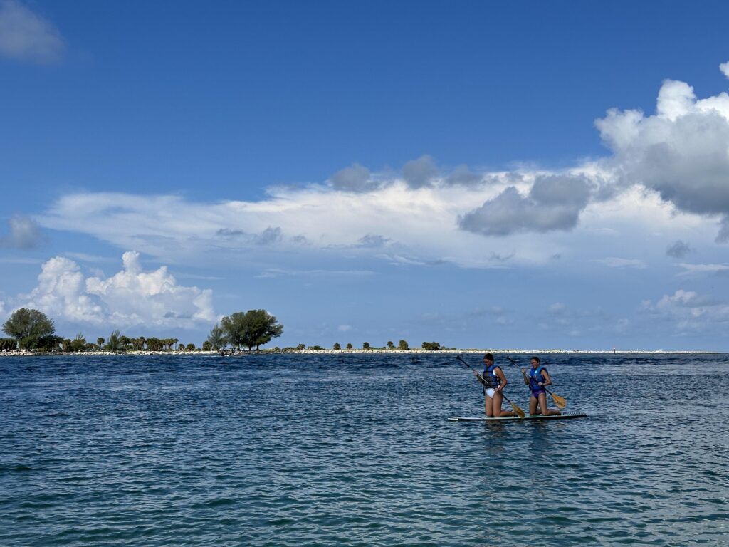 The bay offers the perfect kayaking and paddleboarding location with its calm, turquoise waters. We took advantage of hiring paddleboards from the hotel and whilst I only had relaxation on my agenda and watched from dry land, the girls and Ian had a workout as they paddled along the bay which is worth doing for the views. Especially the crystal-clear waters which allowed them to see the bottom of the sea throughout their entire session.