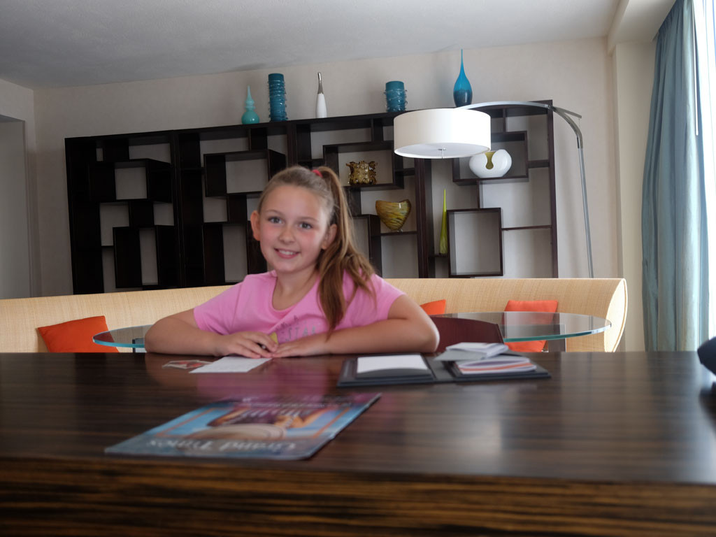 Within the spacious living room area was a giant bookcase, two curved leather sofas and a two glass topped tables for drinks or dining. Chloe in particular made herself at home at the large desk as she enjoyed her Galt activities that we brought over from the UK.