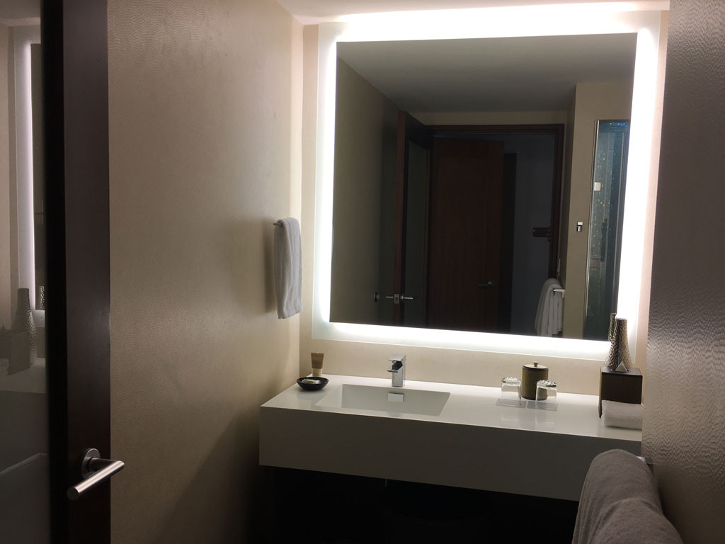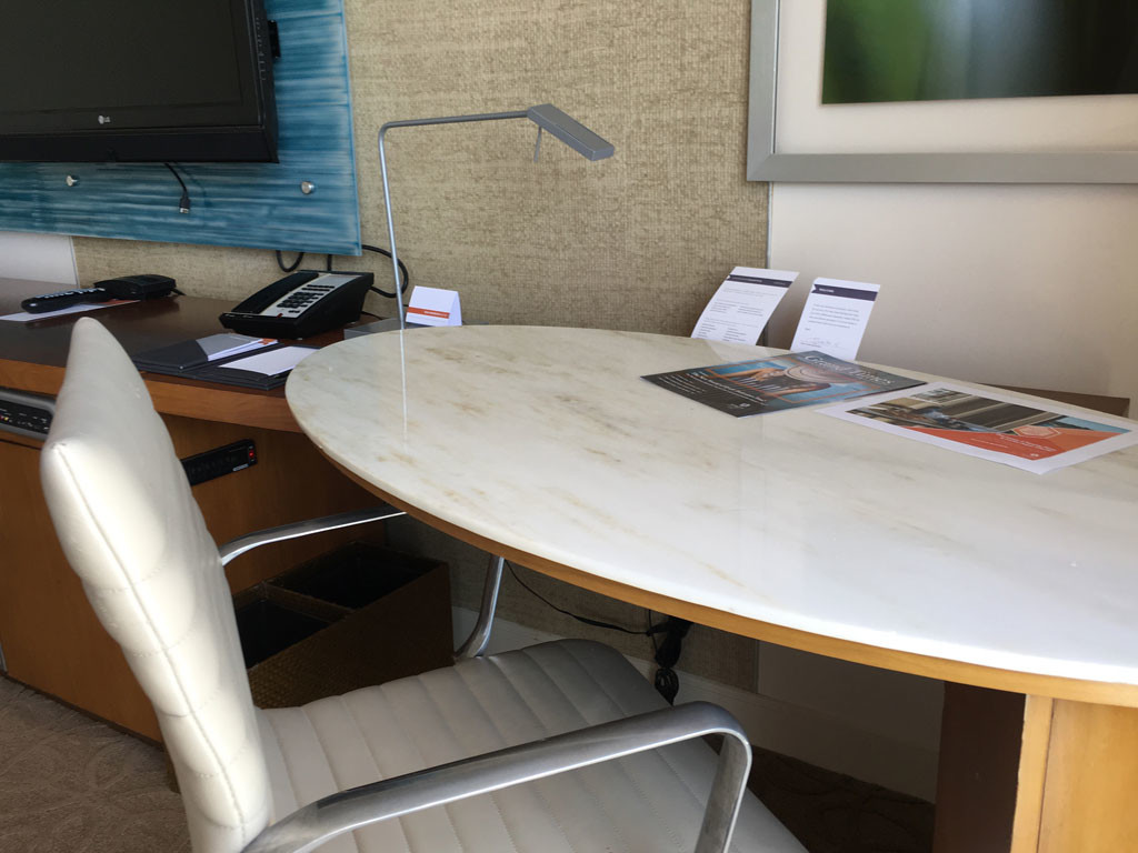 In both rooms there were large wall mounted HDTV and great sized desks with a great view over toward Disney, complimentary high speed WiFi, mini fridge with complimentary water and tea / coffee making facilities.