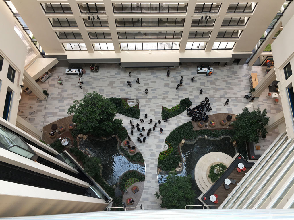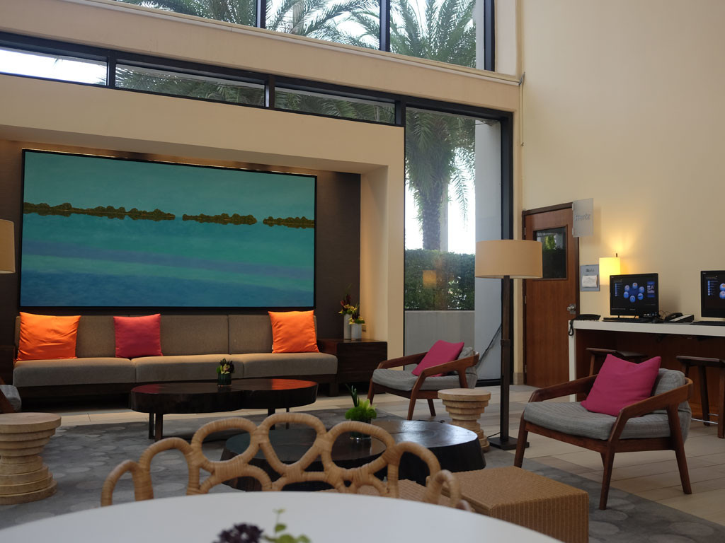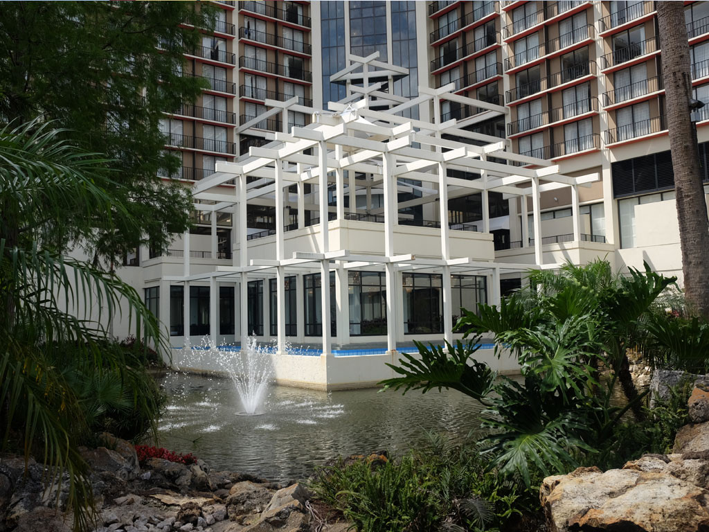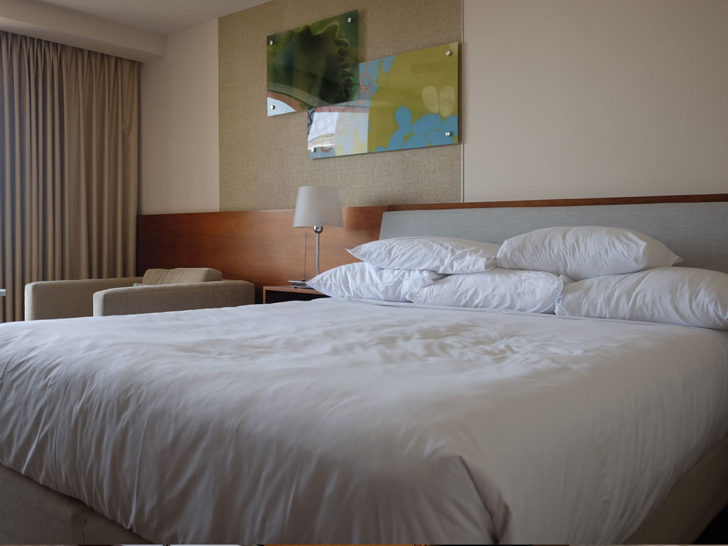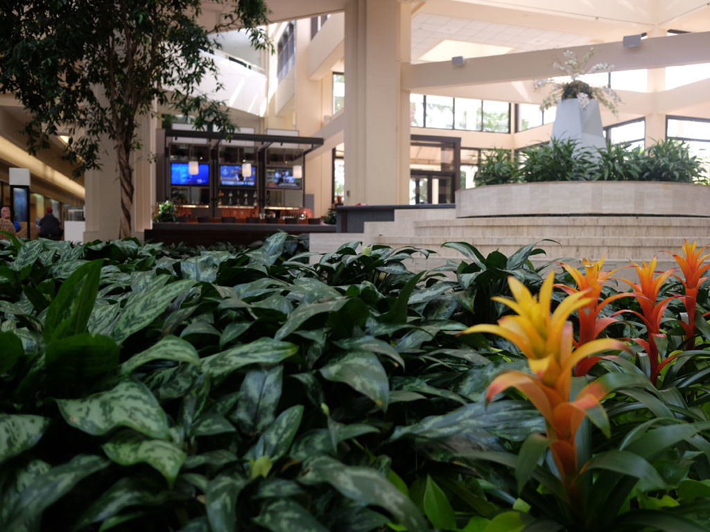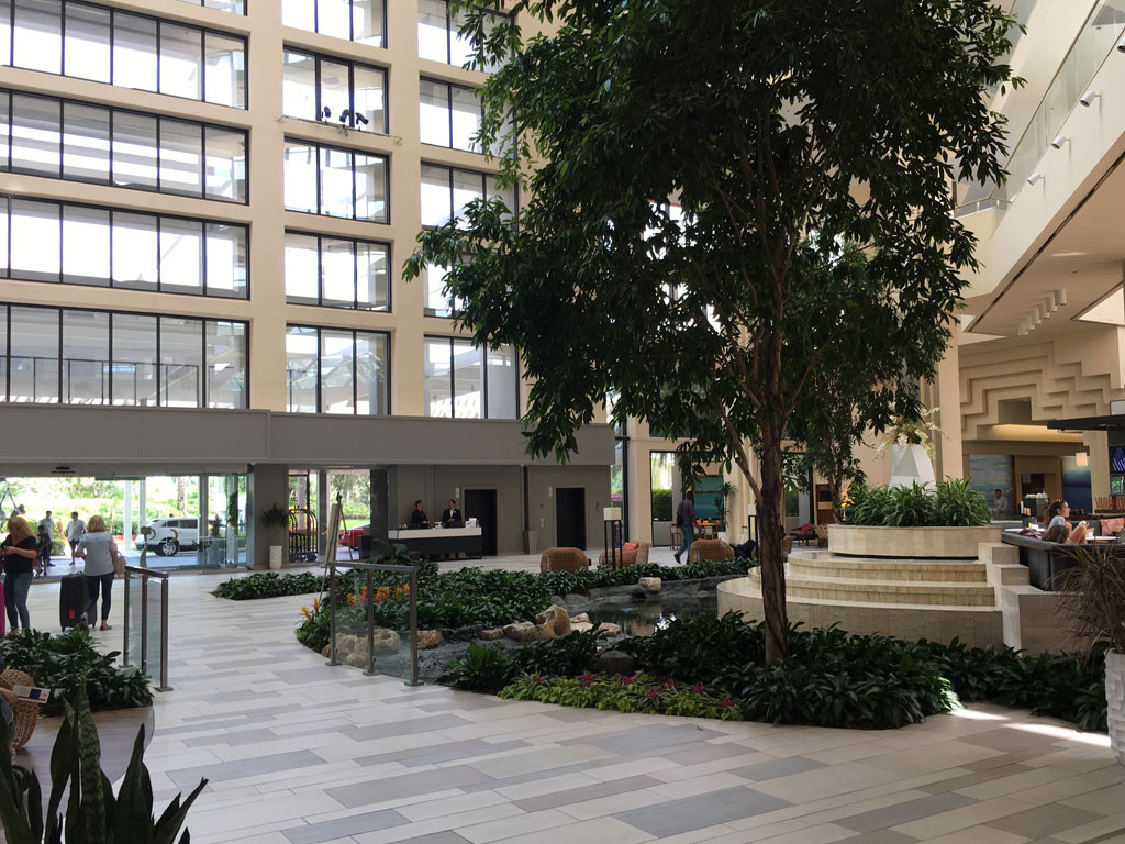 The towering 18 floor glass fronted atrium lobby of the hotel is very modern and luxurious flooded with natural light. Within the lobby were lots of lush plants, trees and even a man- made stream adding to its elegance.