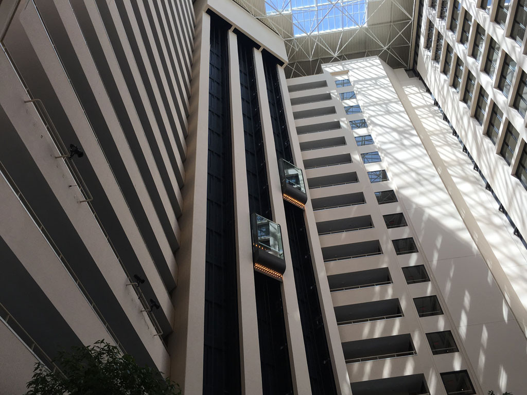 The ride in the glass-encased elevator was fun, and reminded us of the lifts at the Jumeirah Beach Hotel in Dubai as it whisked us up to the 15th floor providing great views over the city.