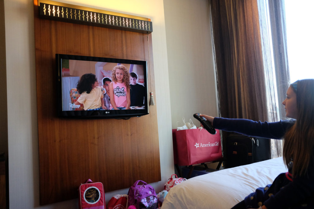 I always say a sign of a good hotel is when the girls make themselves at home.  After recharging on the snacks the hotel had left for us, within minutes of arriving they had  covered their beds with their favourite travelling toys, took control of the large wall mounted flat screen TV (which would typically be the Disney channel) and connected their iPads to the hotel’s free high speed wifi.