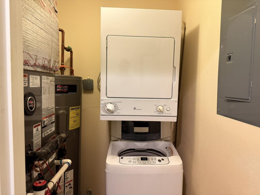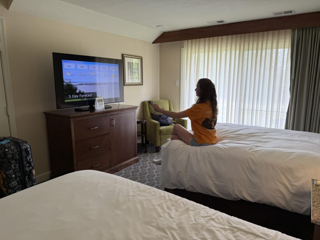 The condo itself offered about 1,200 square feet of spacious living space, giving us so much more room than a traditional hotel room. Inside, we found a fully equipped kitchen — complete with oven, microwave, and dishwasher — plus a full-size washer and dryer, which would be ideal for longer stays or road trips. While we didn’t cook, we used the kitchen and the huge fridge/freezer to chill drinks and snacks, which was really convenient.