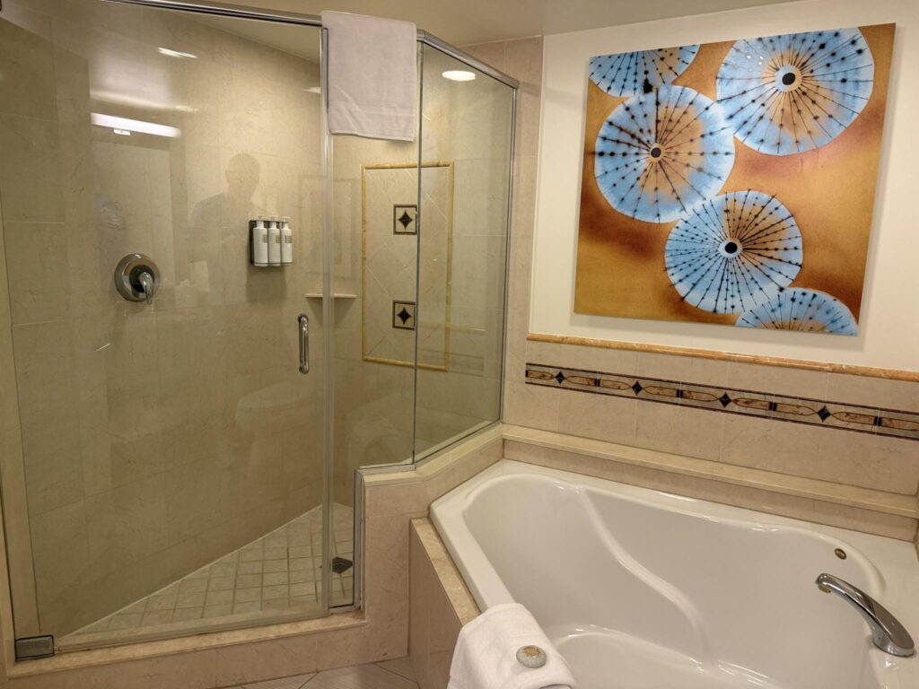 The bathroom was spacious, featuring a large walk-in shower, a separate bath, and double sinks.