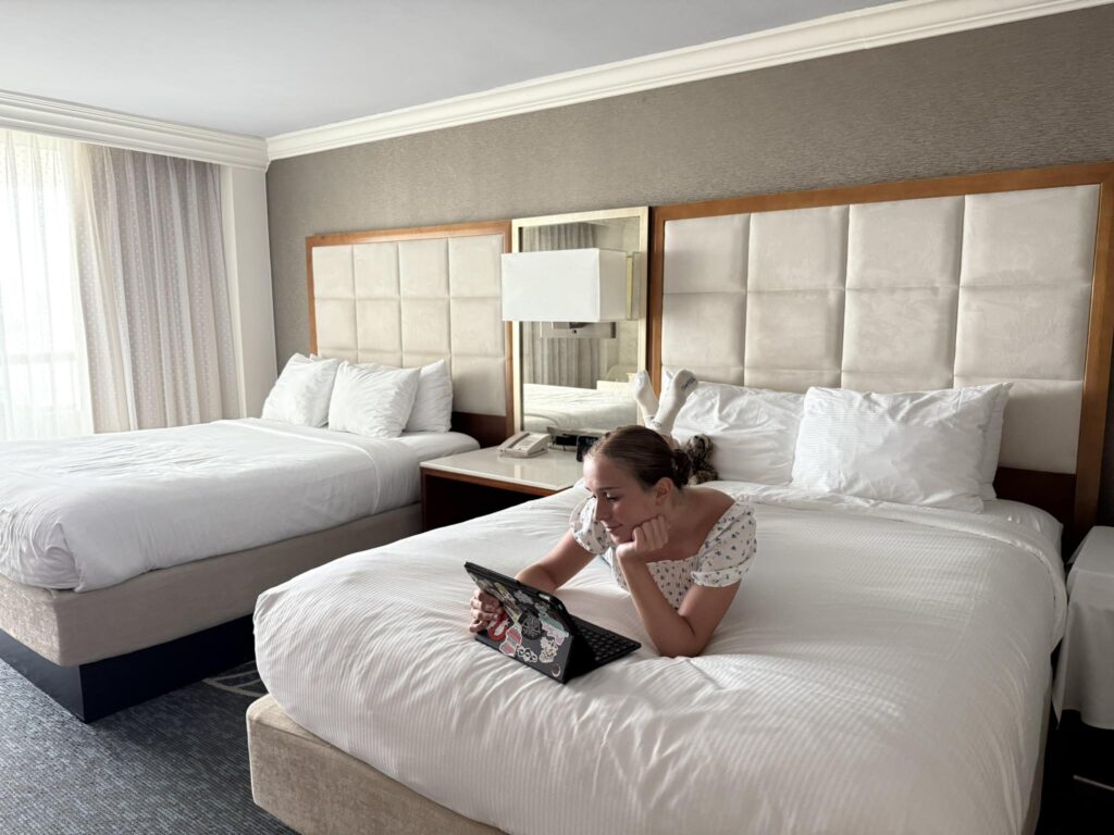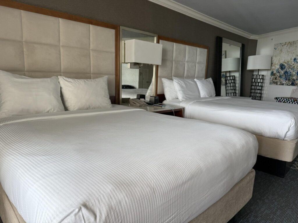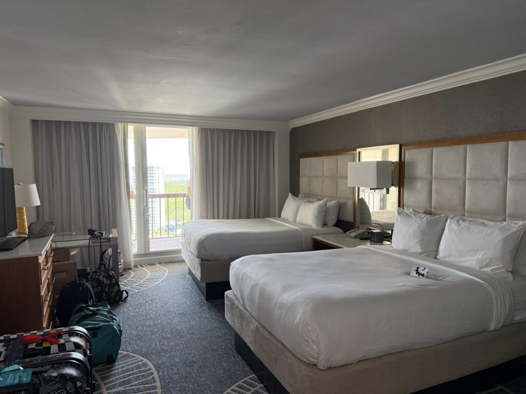 The room had two queen beds, ideal for a family of four, and was modern, clean, and spacious at around 465 square feet, with plenty of space for luggage after two weeks travelling around Florida.