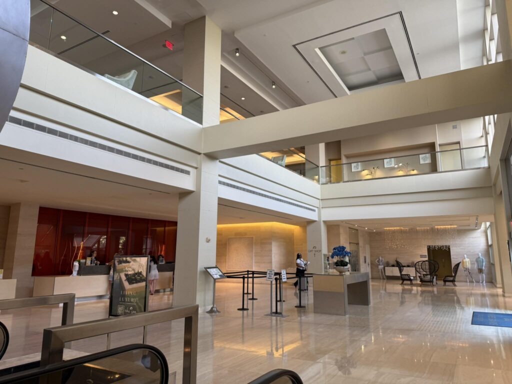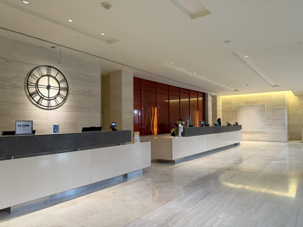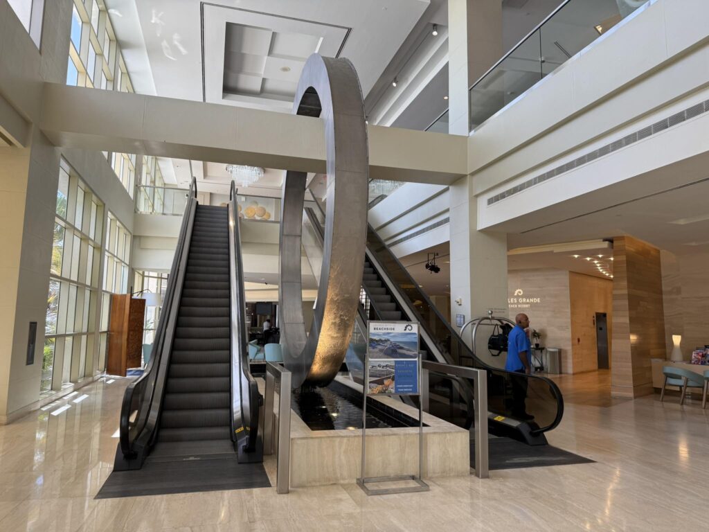 The main building is an 18-story tower, and stepping into the marble lobby feels grand and a little corporate, reflecting the fact that the resort welcomes both leisure travellers and conference groups. The lobby itself is sleek and modern, with cosy furniture, water features, and twin escalators leading to a mezzanine level.