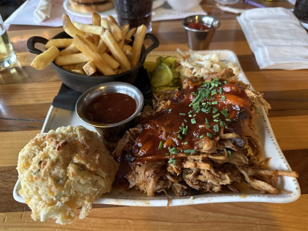 My husband went for another of their most popular and famous dishes, shredded BBQ pork, mac and cheese and cheddar biscuit.  The staff here are great and its fine to ask for substitutions, he swapped out the mac and cheese for fries.  This was so good, the pork was tender and delicious, if you like BBQ food this was cooked to perfection.