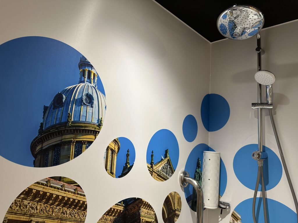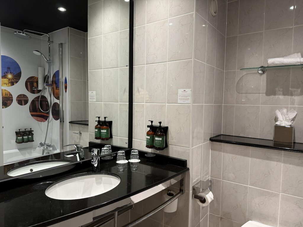 The two bathrooms were clean and functional and I did like the artwork with references to Birmingham on one of the walls.   Whilst my preference is a walk-in shower, the shower over bath in our room was powerful enough for a refreshing shower, and was well stocked with premium amenities.  Another bonus of booking the premium rooms here is that that they also come with added extras such as fluffy robes and slippers.