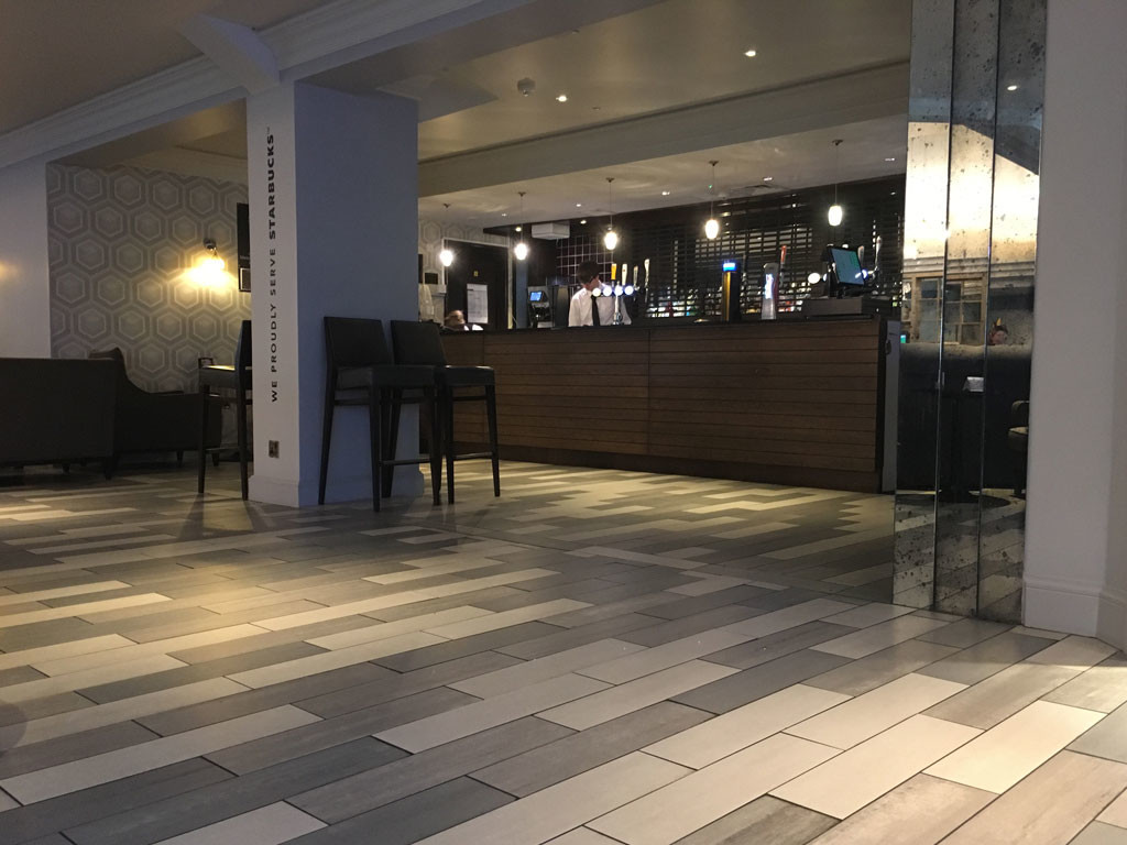 The lobby area of the hotel also comprises a communal space to relax in with comfy sofas and a bar area with a good selection of alcoholic drinks and a Starbucks coffee concession.