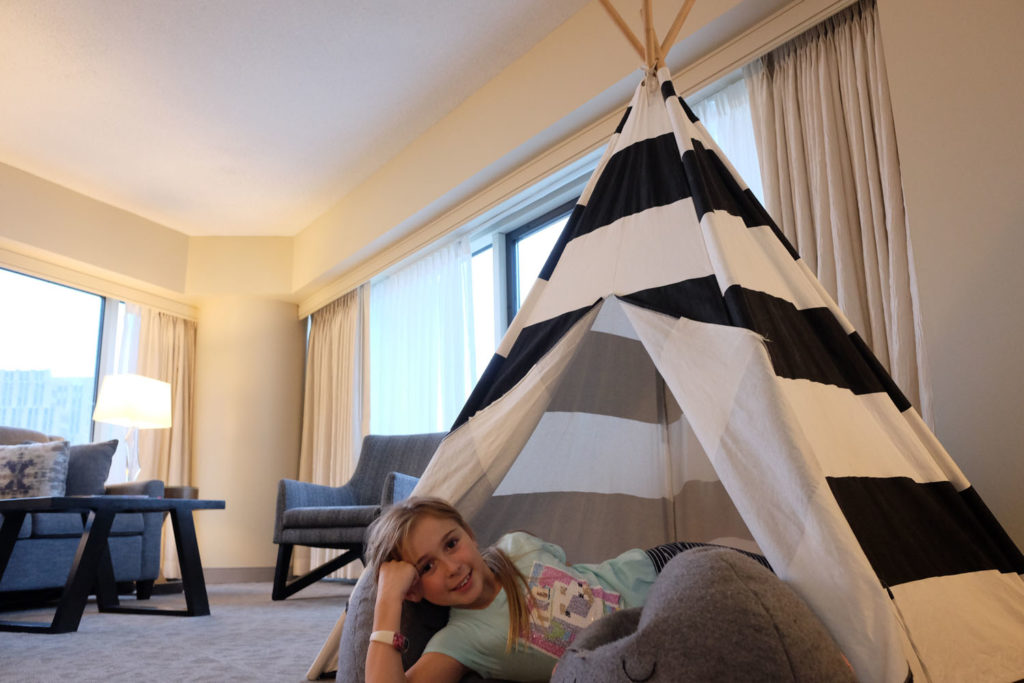 The fun kids theme continued into the living area where the hotel had set up skittles for us to play but Holly’s favourite was the tepee that was set up complete with complete with its own mattress and bedding.