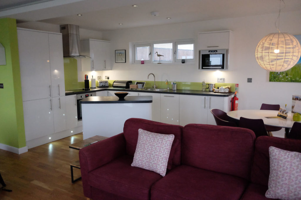The open plan design of the kitchen leading onto the living area was a fabulous family space with comfortable sofas, large TV and bi-folding doors leading out onto the spacious decking which, along with the hot tub, had patio furniture and a BBQ area.