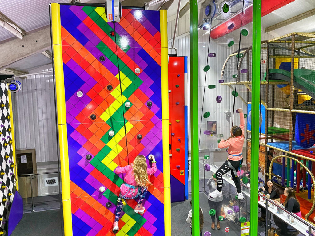 We began our day watching the huge waves crashing onto the beach of Portreath before heading to Base Camp, a 2000 sq ft indoor activity centre at Gwel an Mor with soft play, café and the part we were most looking forward to – the indoor climbing walls.