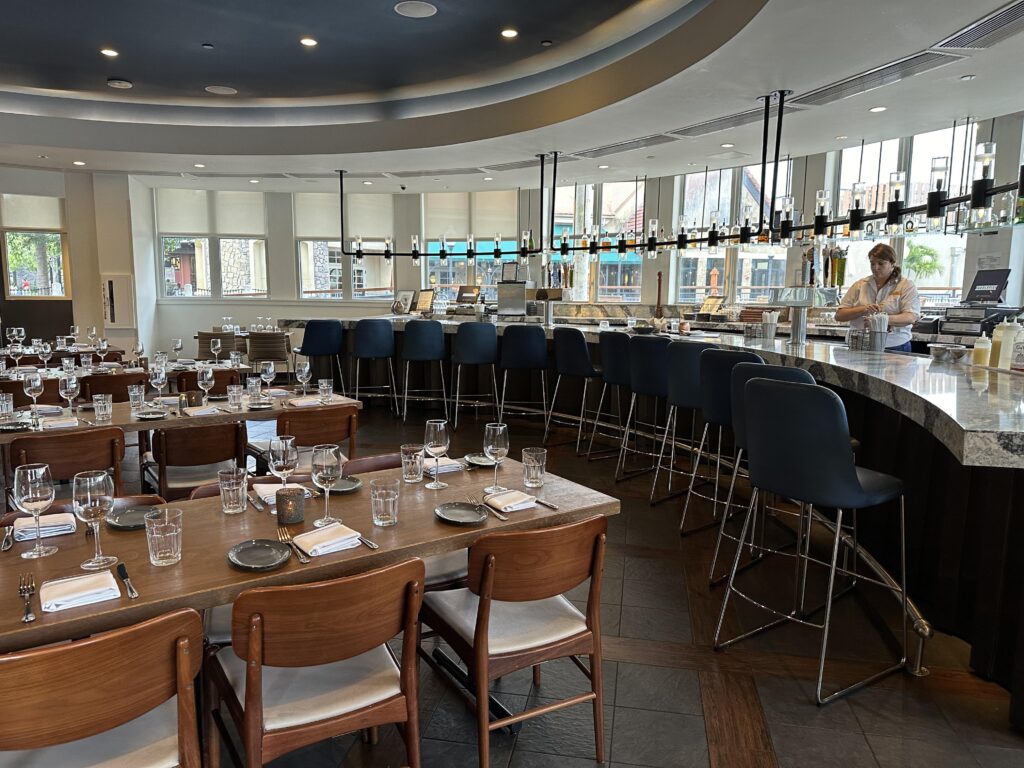 Set over three dining floors, it’s a large restaurant and the closest you can come to dining on a luxury ship without setting sail. I particularly love the interiors here which wouldn’t look out of place on a luxury yacht with a colour pallete of cool grays and whites and although its one of the more upmarket dining venues at Disney Springs, it’s also family friendly, which is one of the reasons why we continue to come back here.