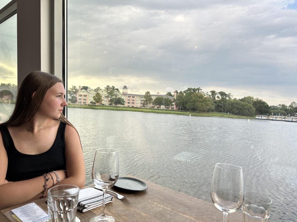 I was really happy that our table was on the lower level as this provides some of the best water side table seating and we had gorgeous views through the floor to ceiling windows out over the water and Disney’s Saratoga Springs Resort.