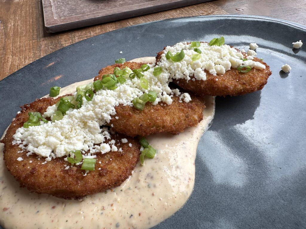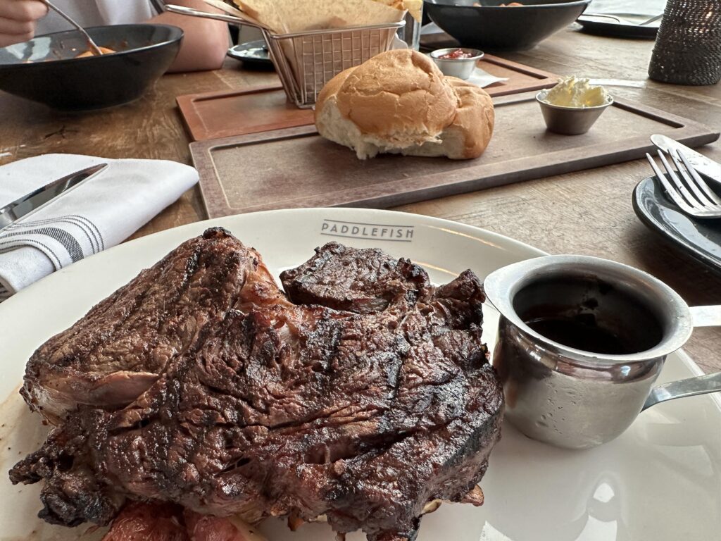 My husband, on the other hand, doesn’t share my passion for seafood, but that’s one of the things we love about Paddlefish—their “from the land” options are just as impressive as their seafood. He decided to try the fried green tomatoes for the first time, and we were both pleasantly surprised. They were crispy and flavourful, a great introduction to a Southern USA classic. For his main, he went for the 16-ounce ribeye similar to our last visit and once again it was delicious and cooked to perfection