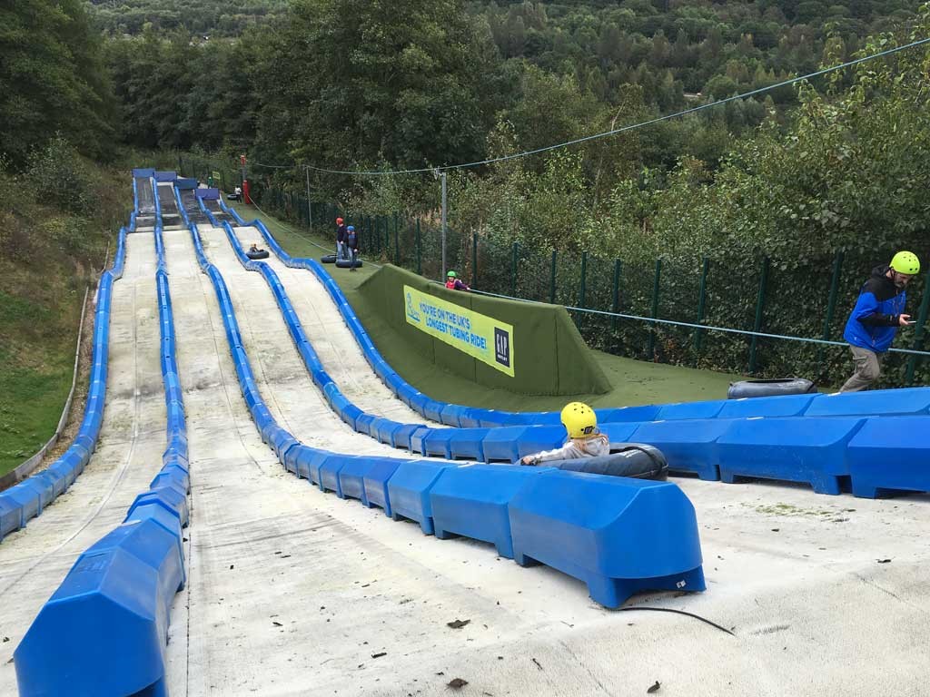 At 120m long the slope is the UK’s longest super tubing ride providing a roller-coaster-like ride down one of its 4 lanes. The surface is artificial snow with water sprinklers which increases the speed of the tube.