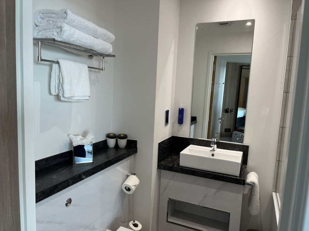 The modern bathroom was a little compact, with shower over the bath and Elemis toiletries – one of my favourites. I know hotels are trying to become more eco-friendly and reduce single use plastics which is why the toiletries were reusable and wall mounted, but I’m still a little apprehensive after Covid, and really didn’t like having these high touchpoint toiletries in the rooms.